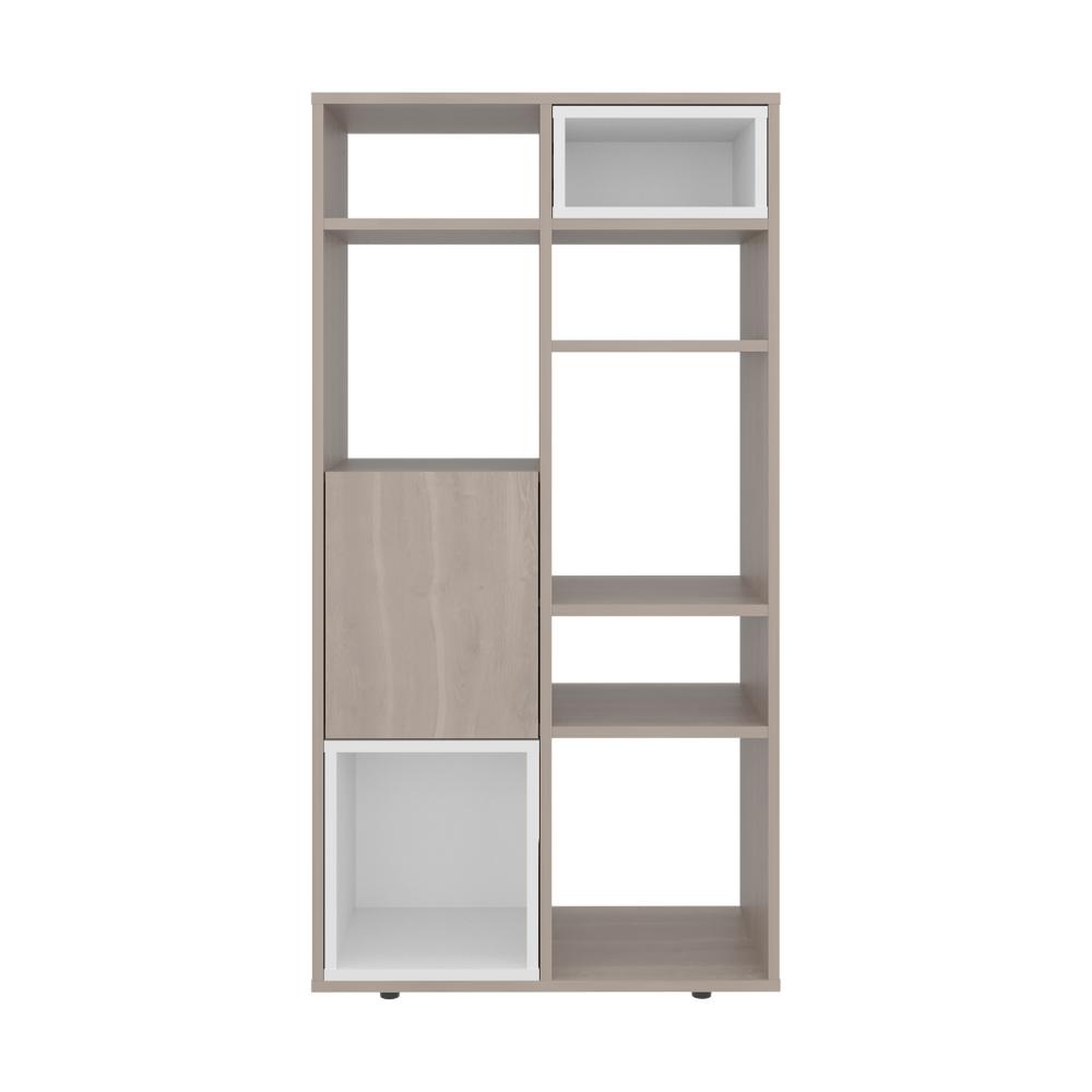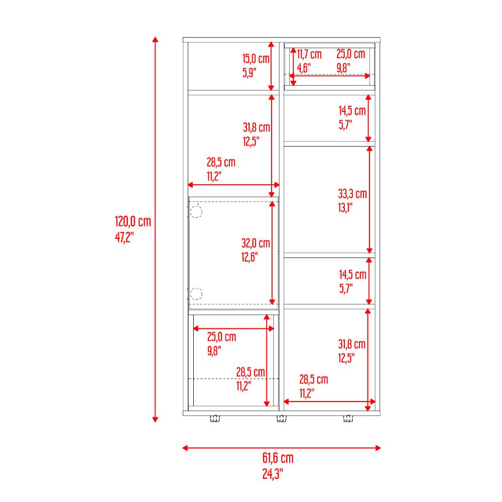 Biblioteca, con espacio para ubicar objetos decorativos, 1 puerta abatible, gran capacidad de almacenamiento y es de facil instalación.
