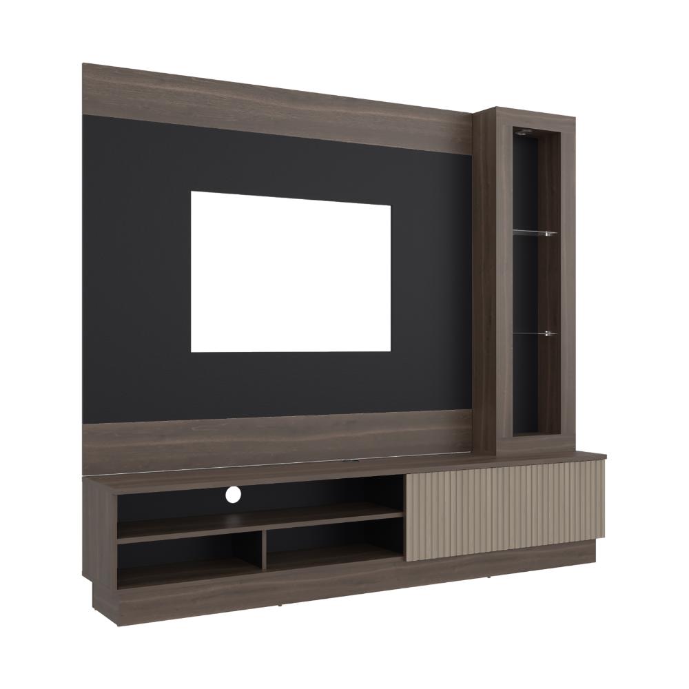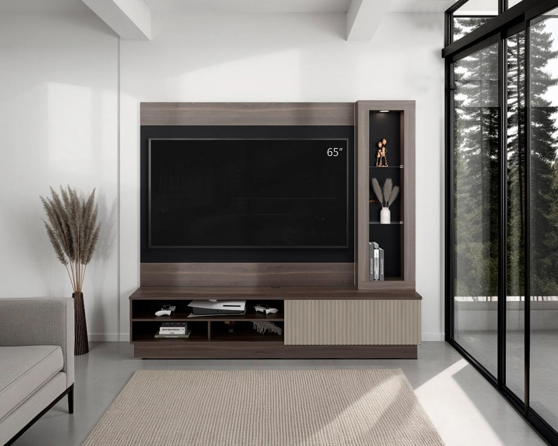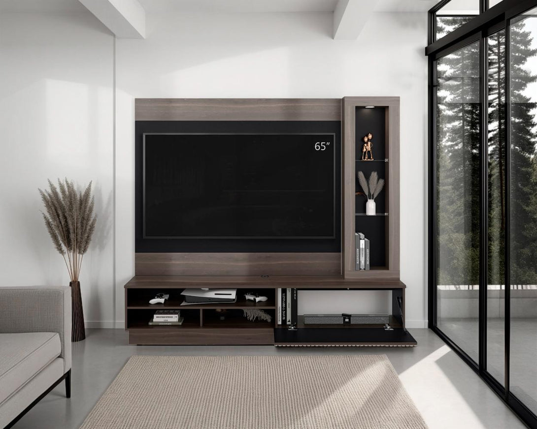 Centro de Entretenimiento para TV de hasta 65'' con sistema de iluminación, compartimentos para objetos decorativos, una puerta batiente, combinación de colores, entrepaño de vidrio.