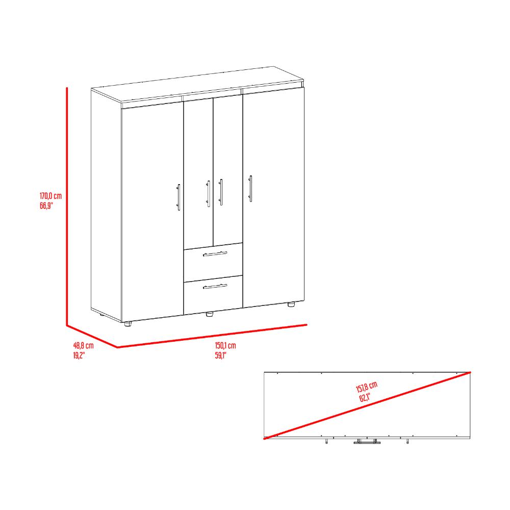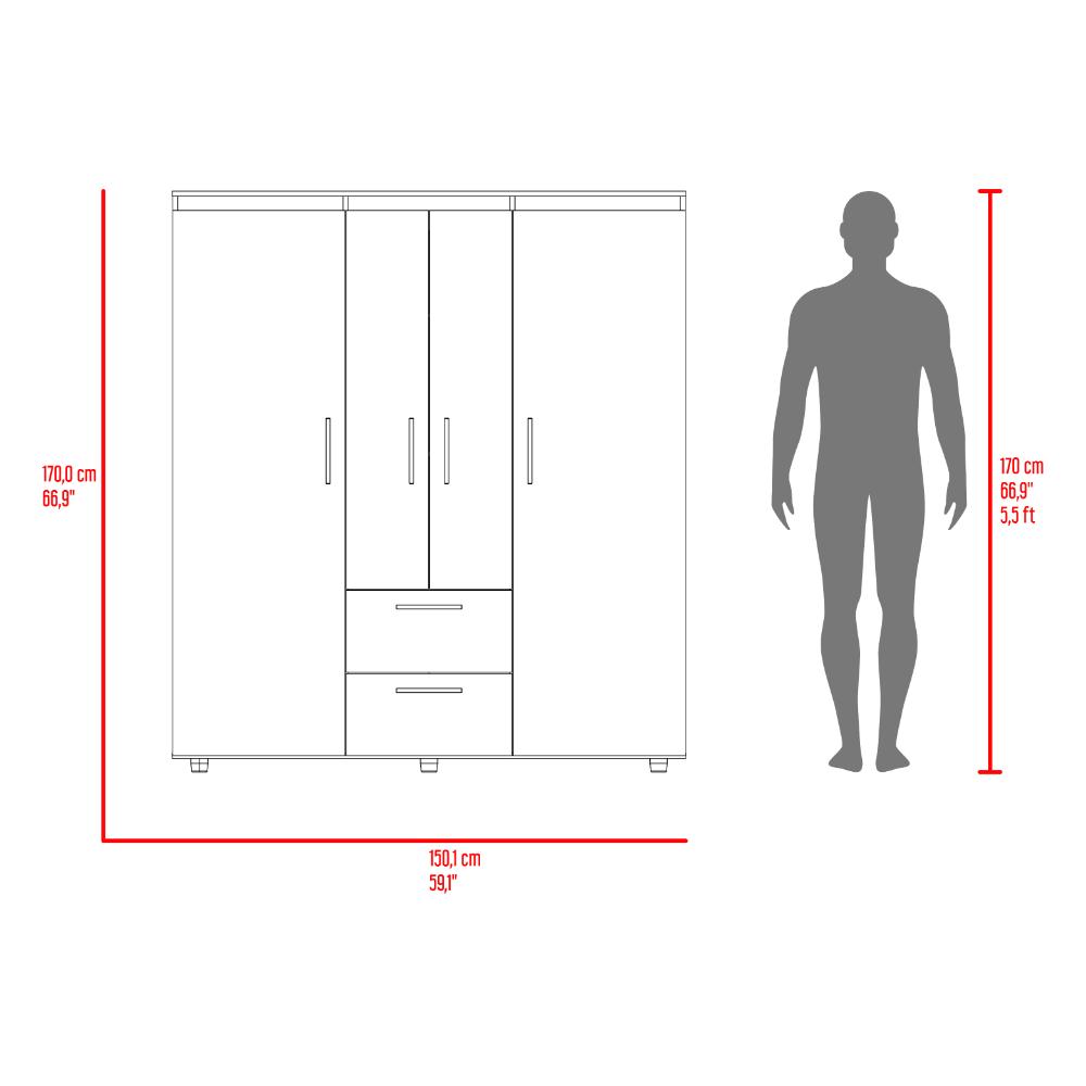 Closet, con 4 puertas batientes, 2 cajones deslizables, 3 tubos pata colgar ropa y amplios espacios de guardado.