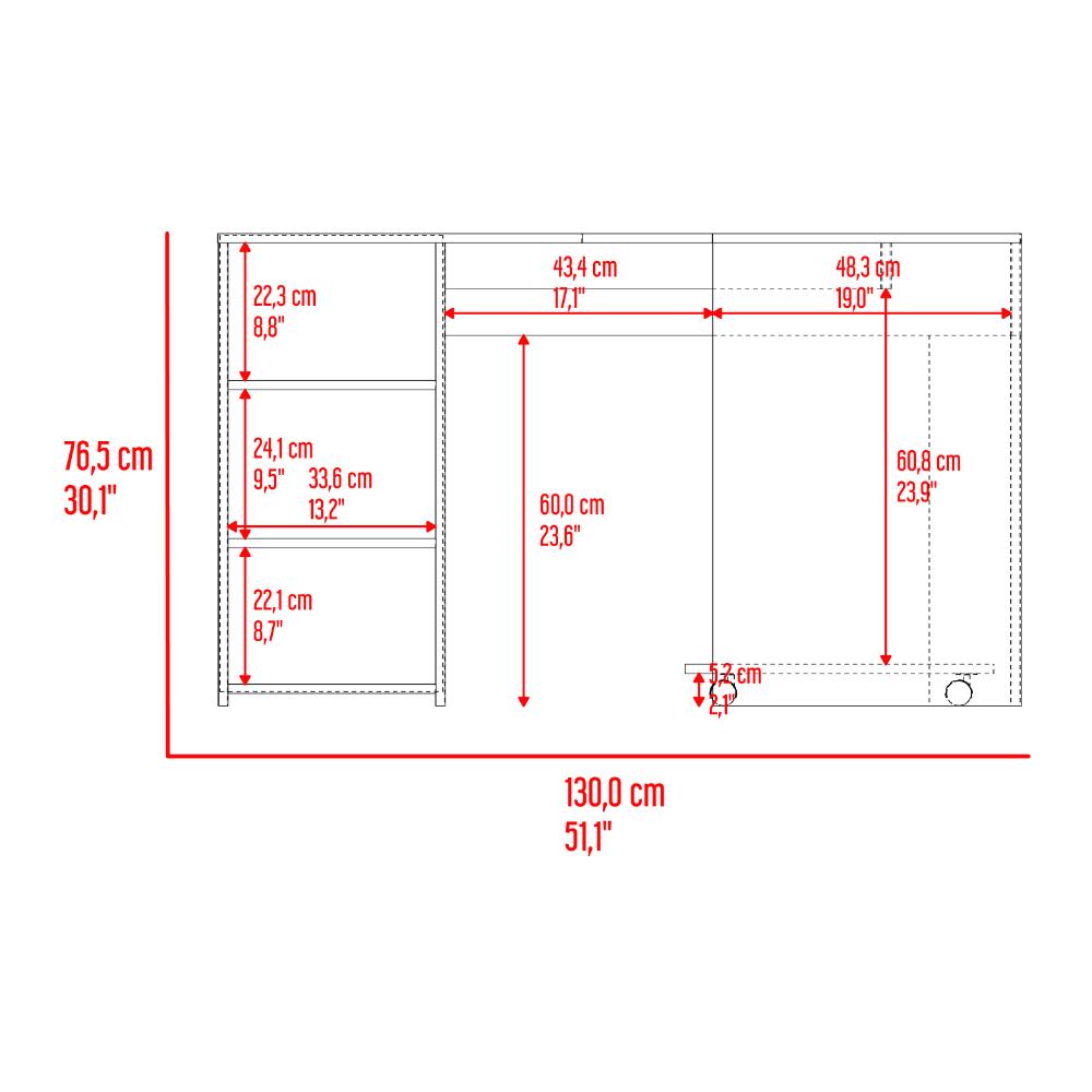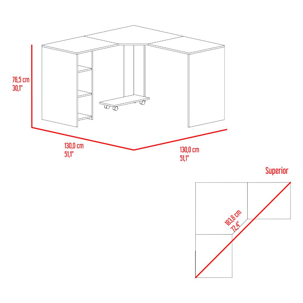Escritorio en L, con 2 entrepaños, espacio para ubicar impresora y base con rodachinas.