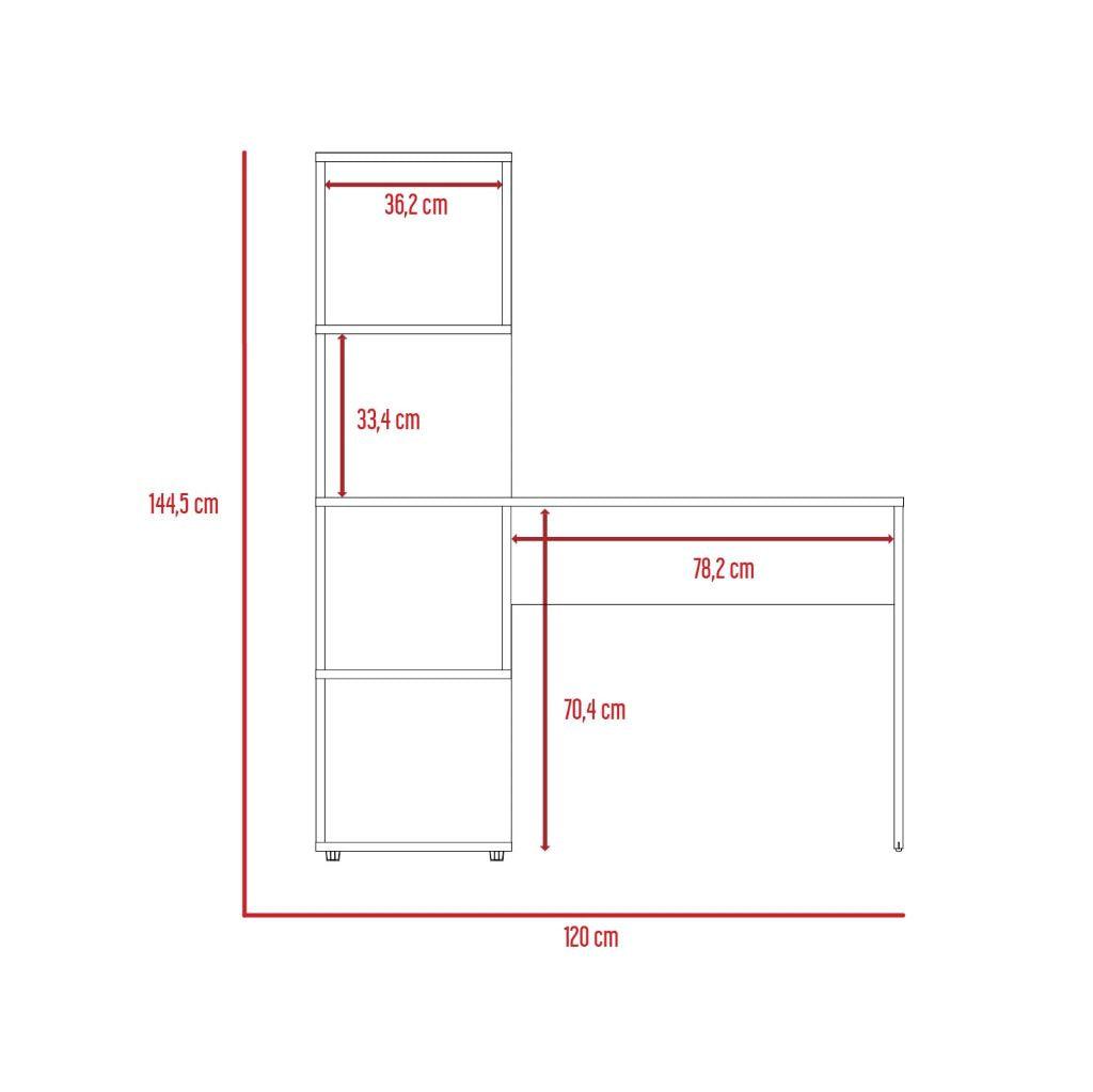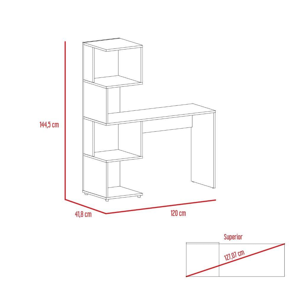 Escritorio, con diseño moderno, 3 entrepaños para ubicar libros y elementos decorativos, y amplia superficie de trabajo.
