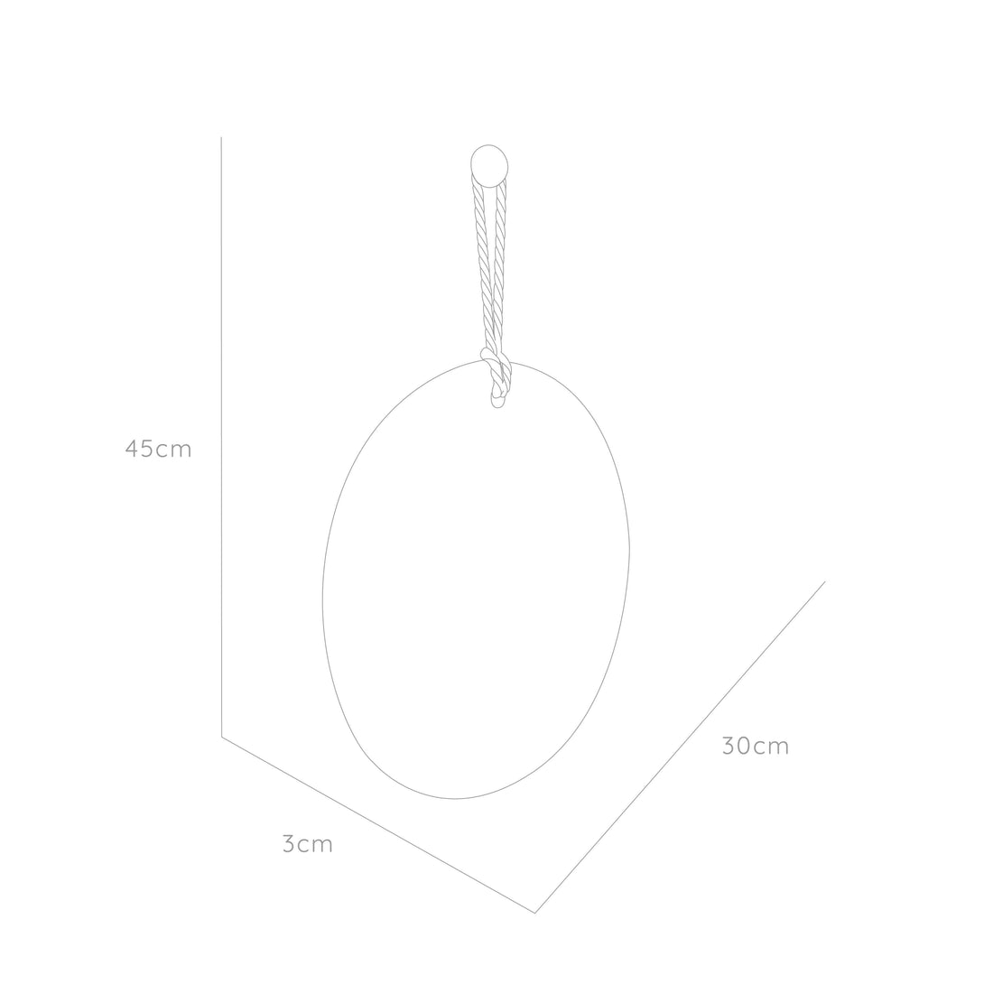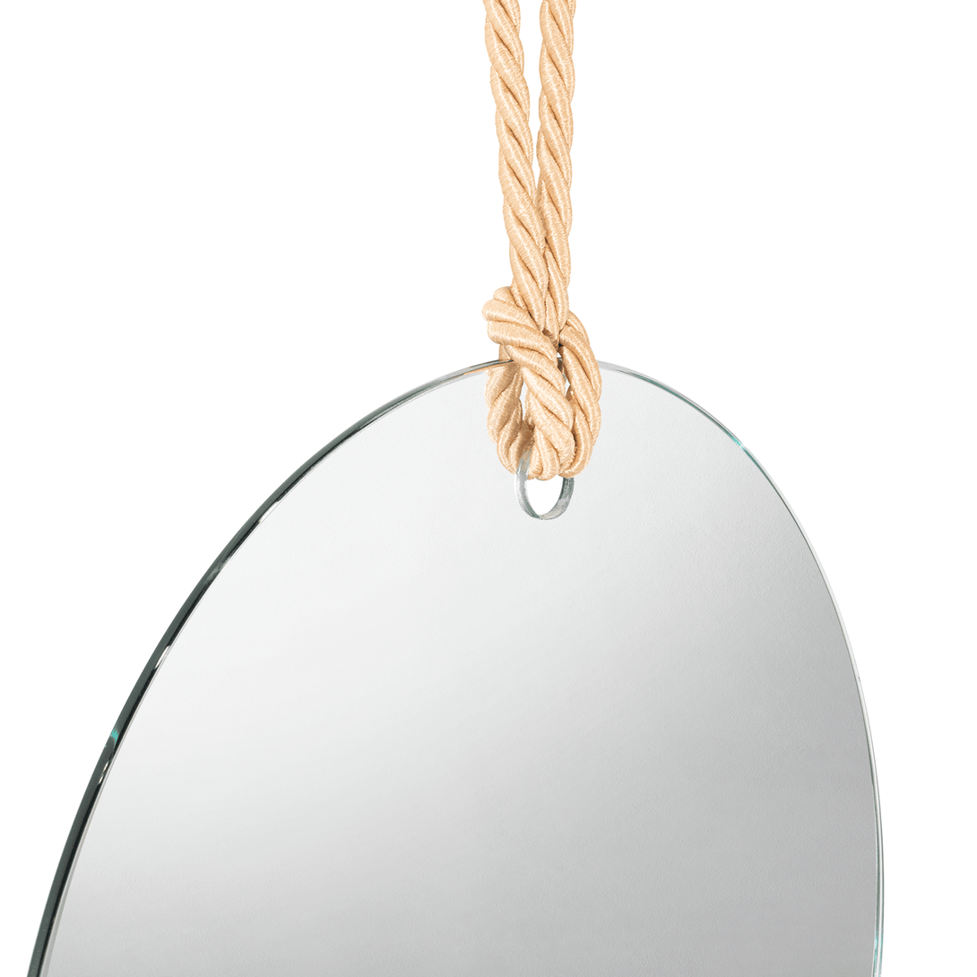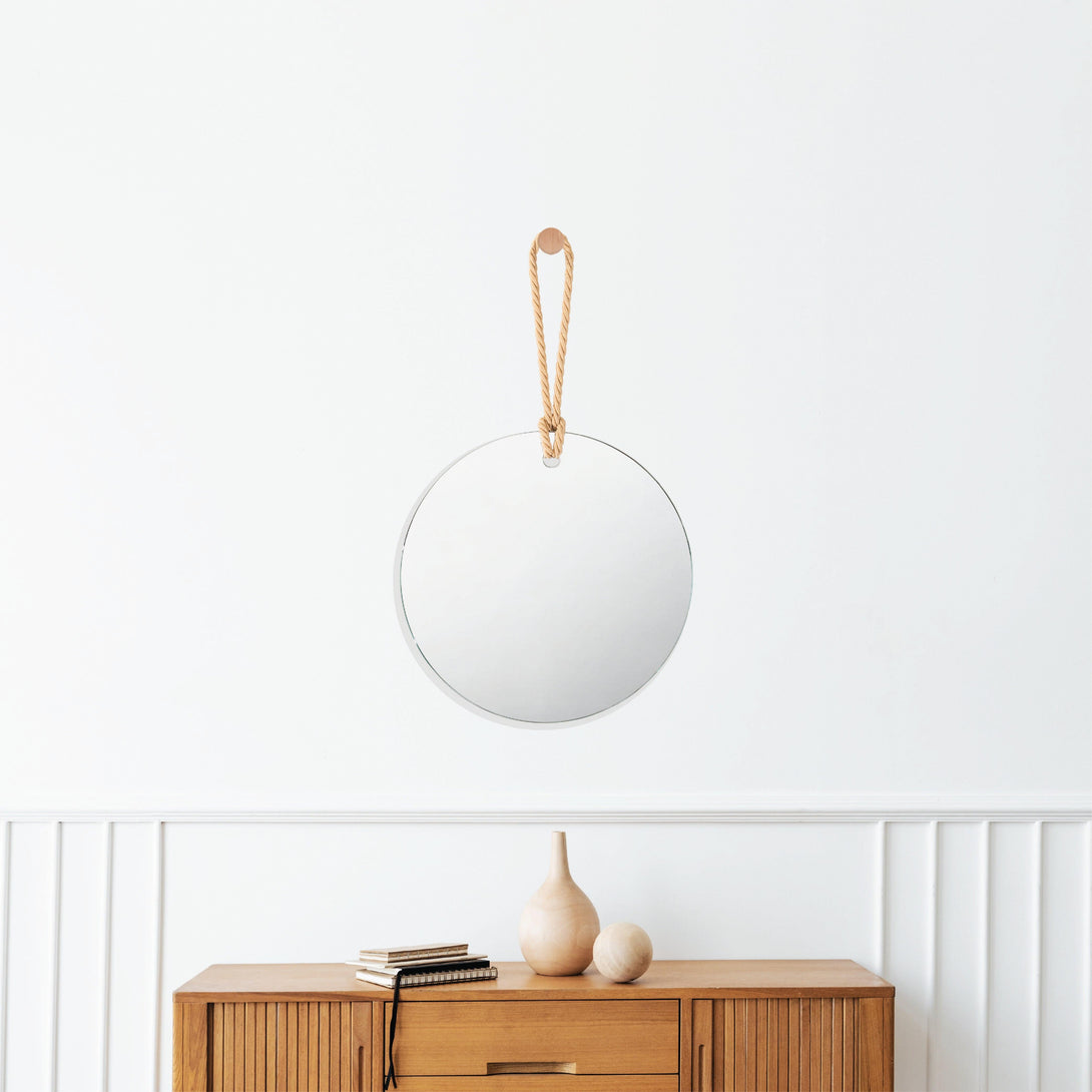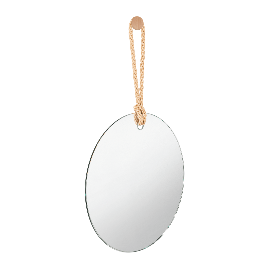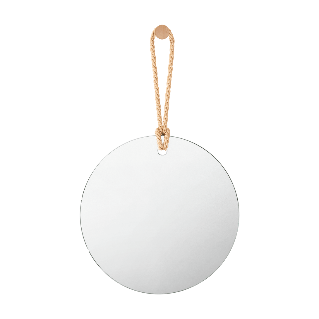 Espejo Circular en Cal 4mm con perforación para cabuya, incluye tope en madera para lazo decorativo.
