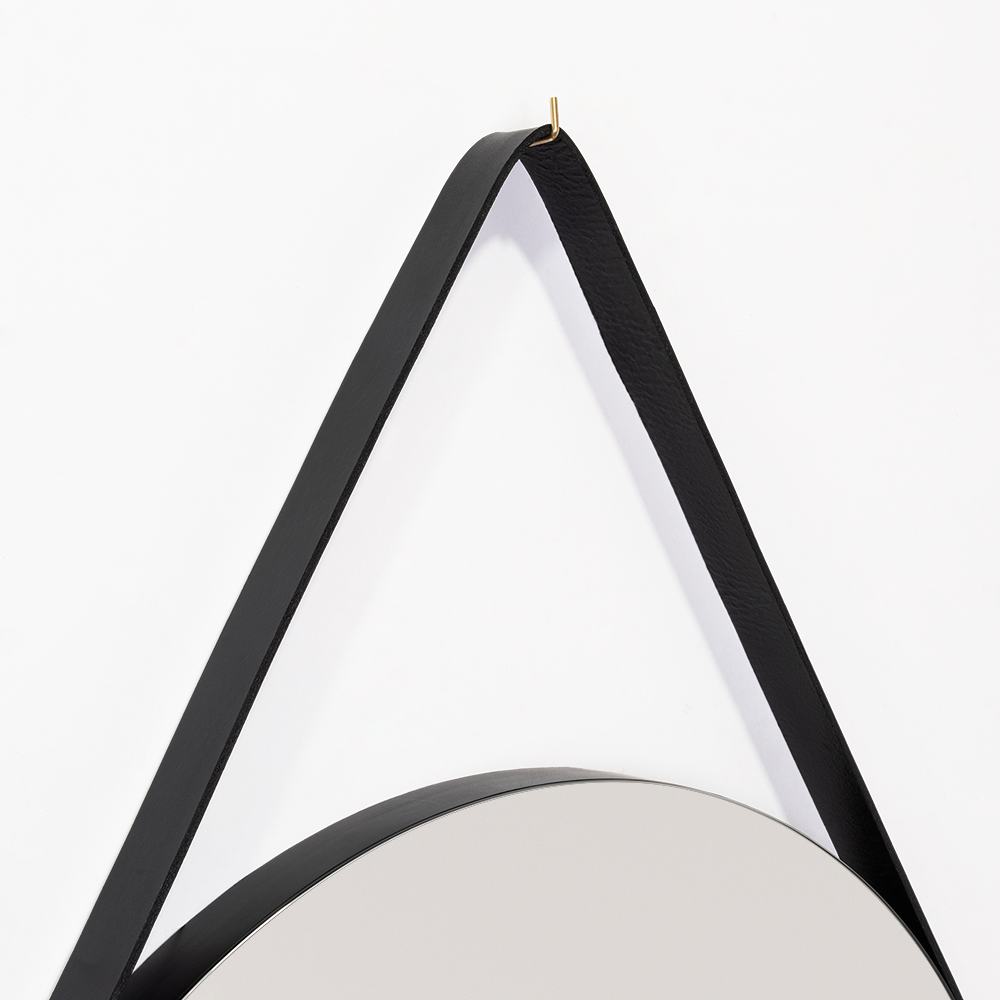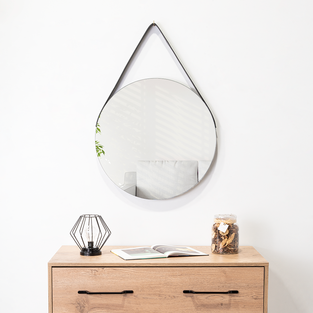Espejo circular con marco aglomerado MDP revestido en cuero y correa decorativa en cuero, ensamble a pared con chaflan