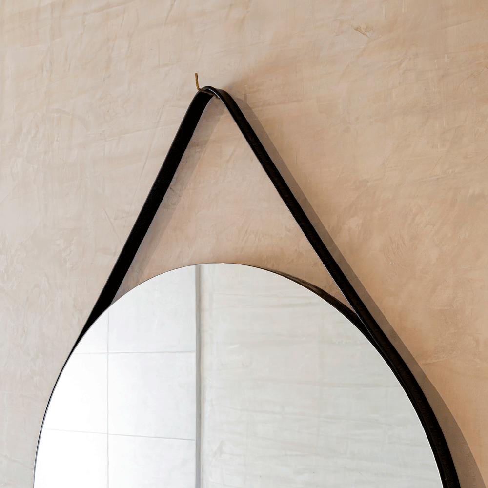 Espejo x2 circular con marco aglomerado mdp revestido en cuero y correa decorativa en cuero, ensamble a pared con chaflan. Incluye herrajes para su instalación.