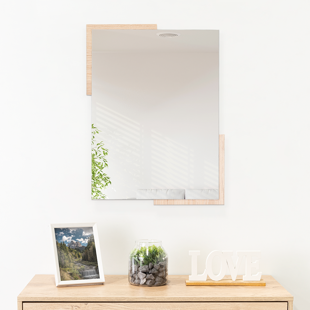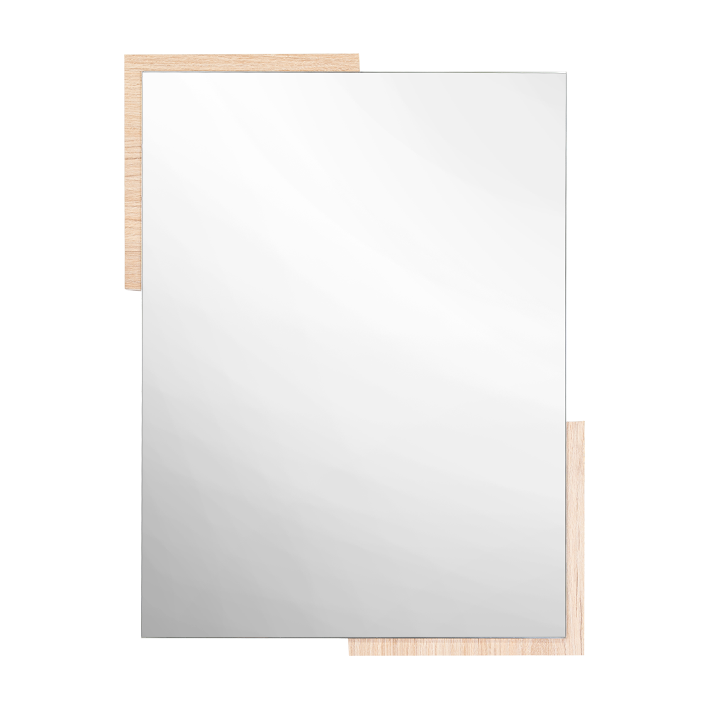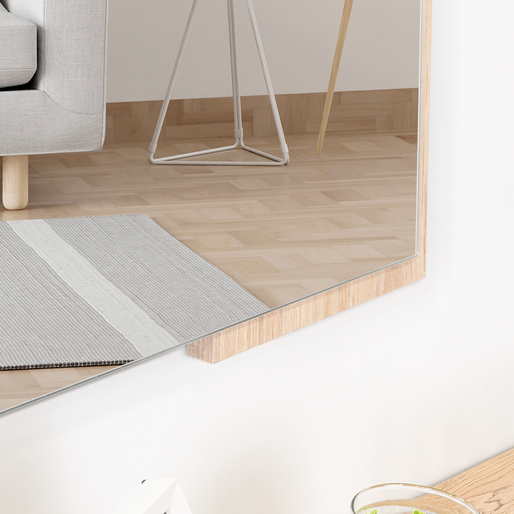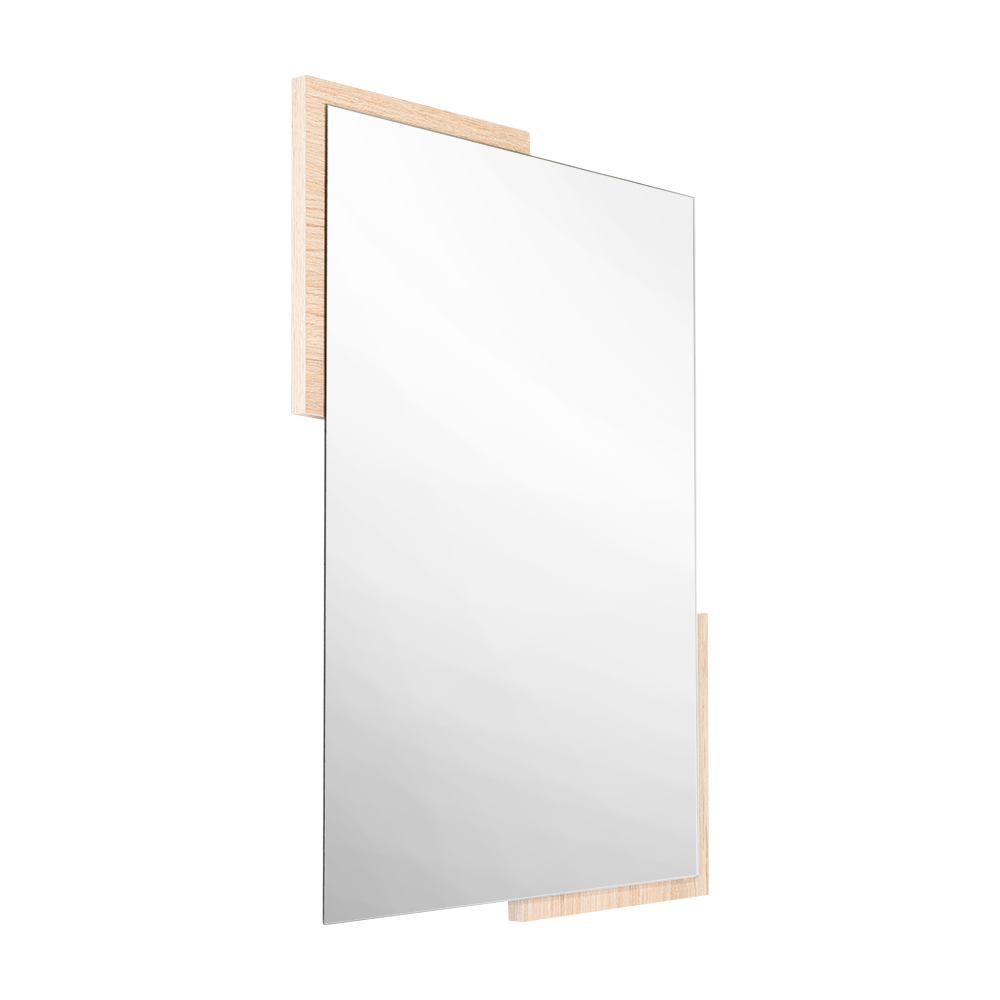 Espejo rectangular con dos extremos en madera clara; ensamble a la pared con chaflán