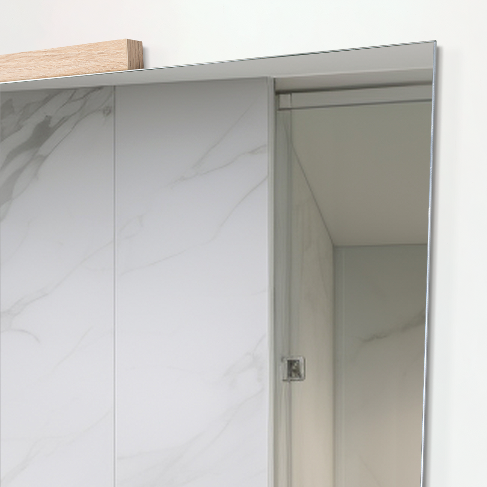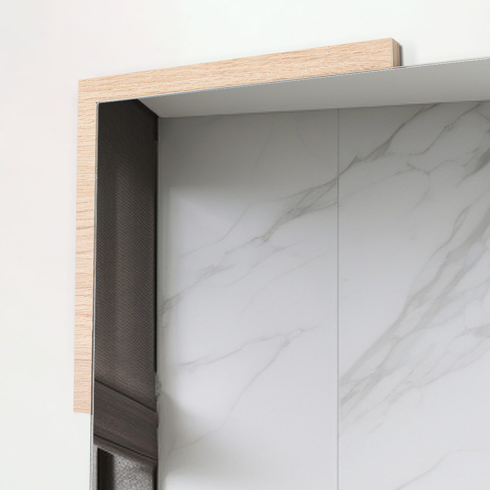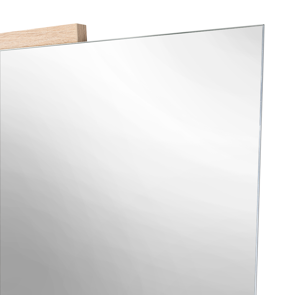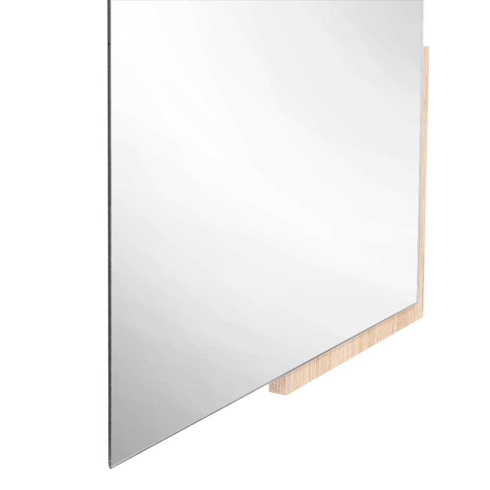 Espejo rectangular con dos extremos en madera clara; ensamble a la pared con chaflán