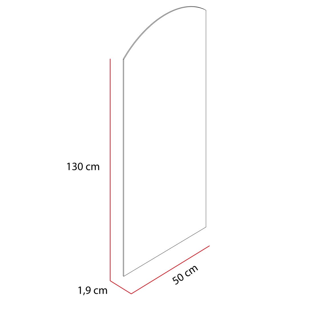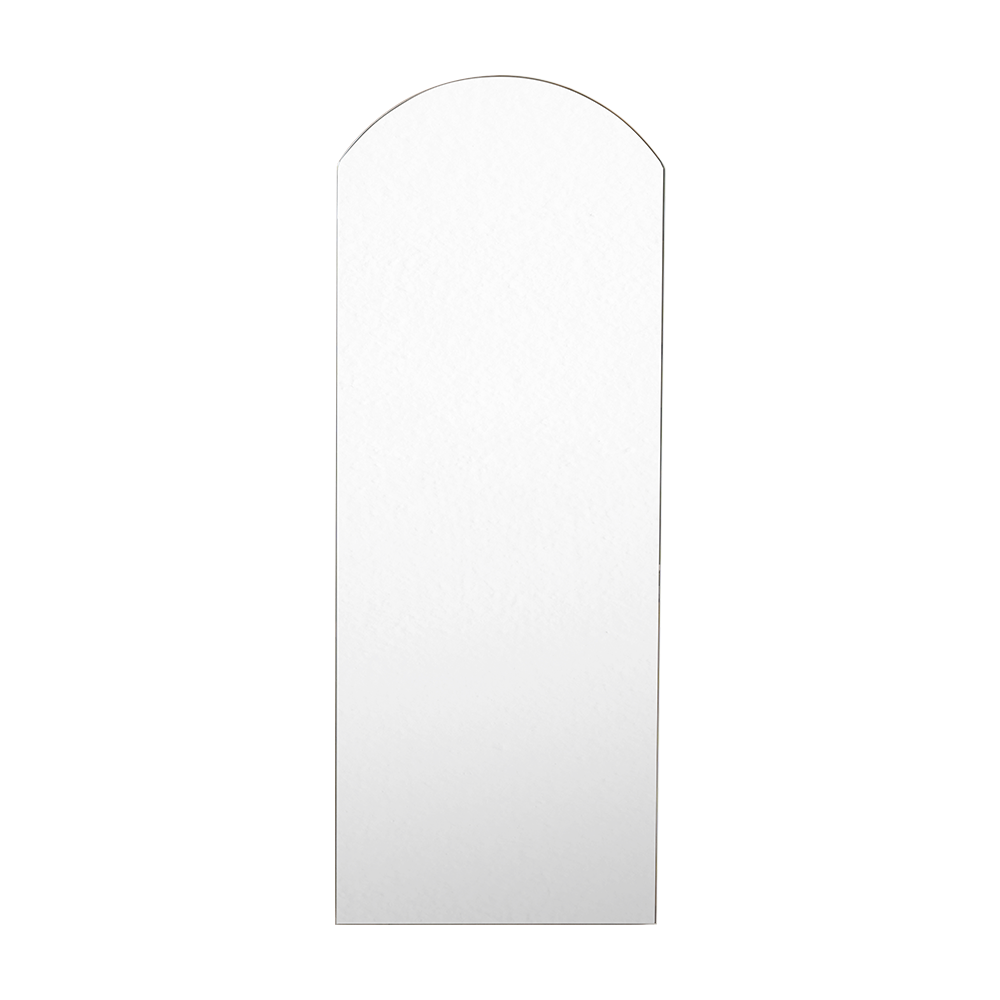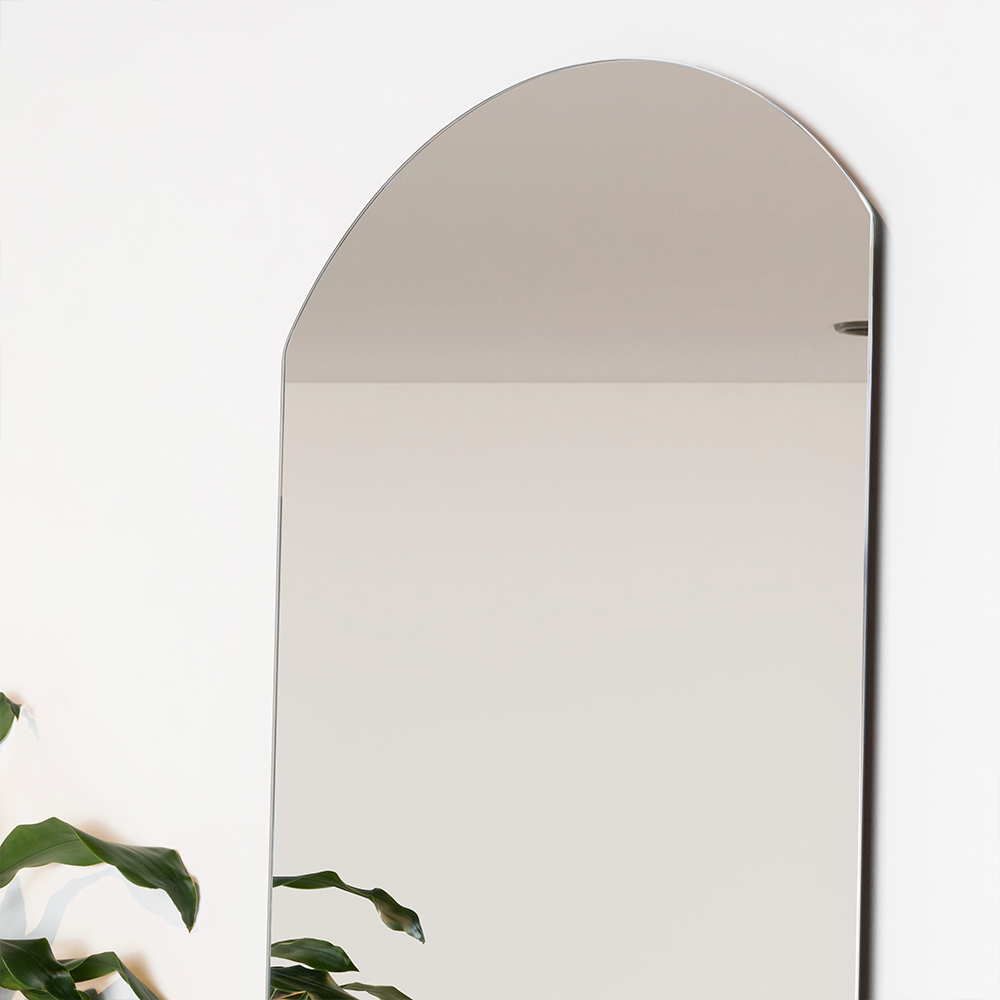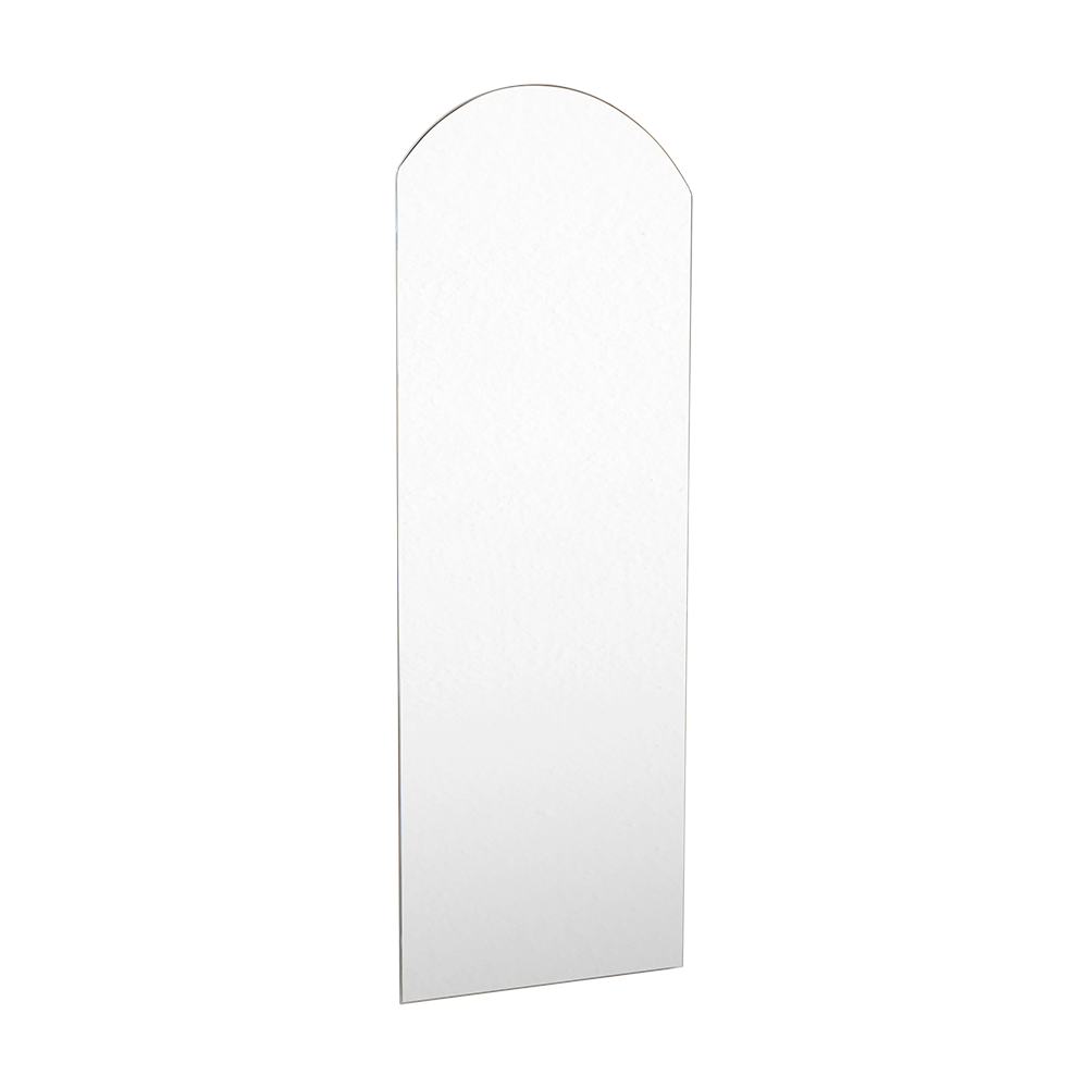 Espejo rectangular, con extremo superior en semicirculo, y ensamble a la pared con chaflan.