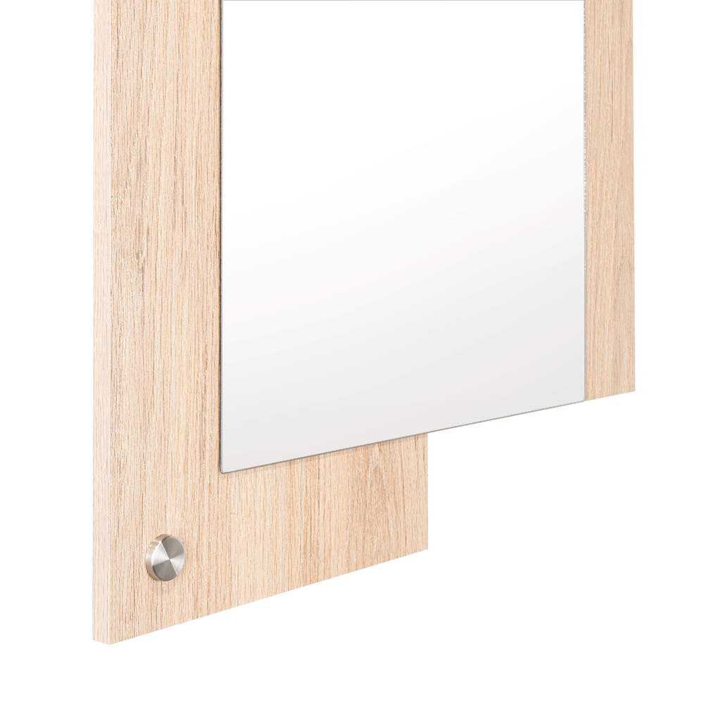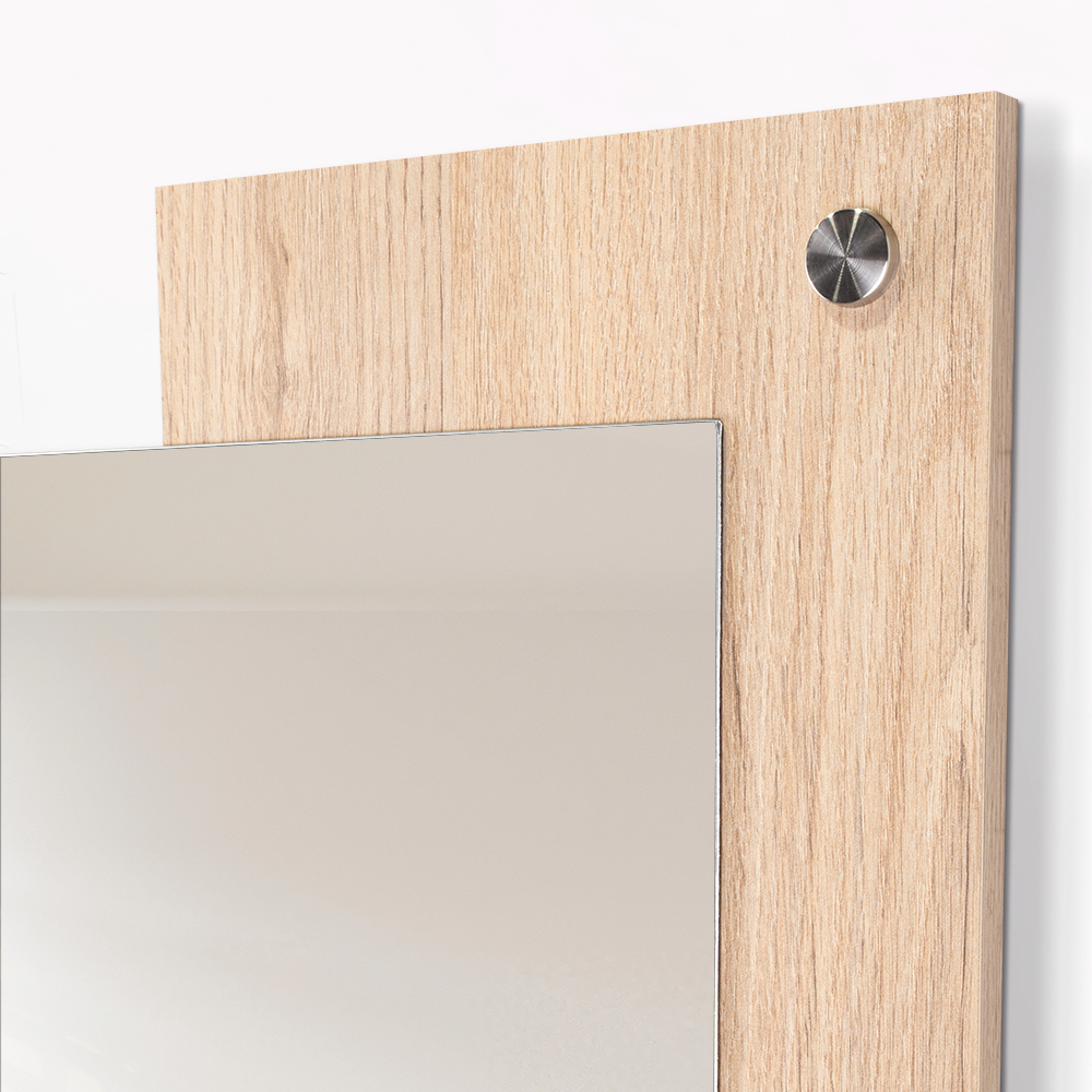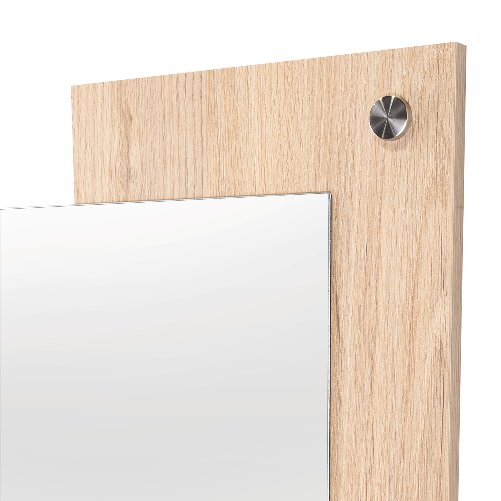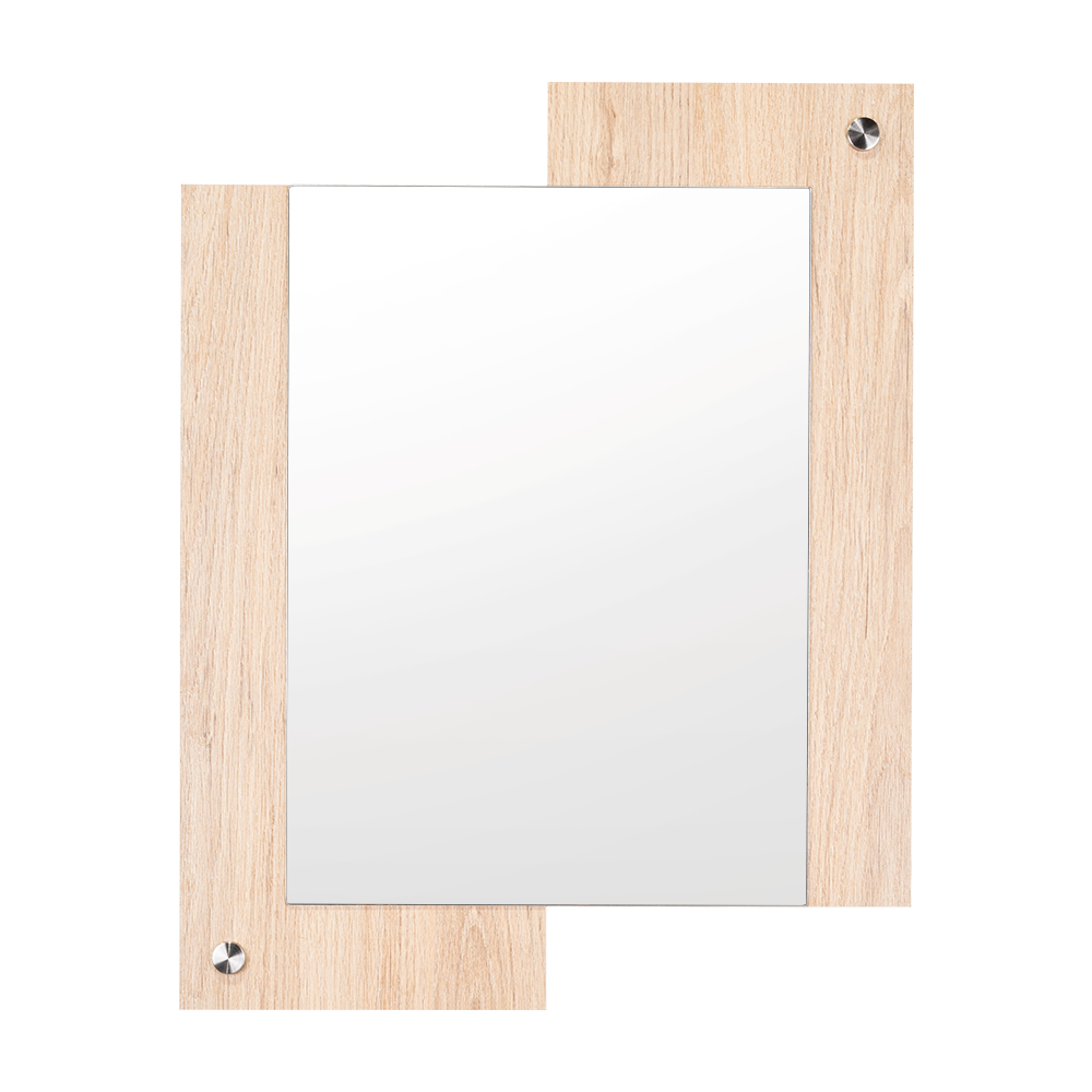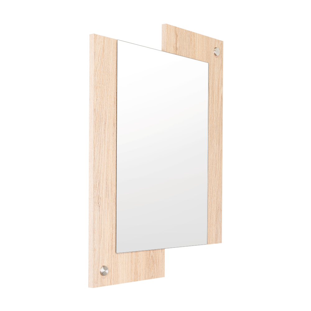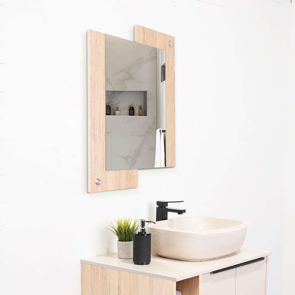 Espejo rectangular con dos extremos en madera clara; ensamble a la pared con chazo y tapa en acero inoxidable decorativa
