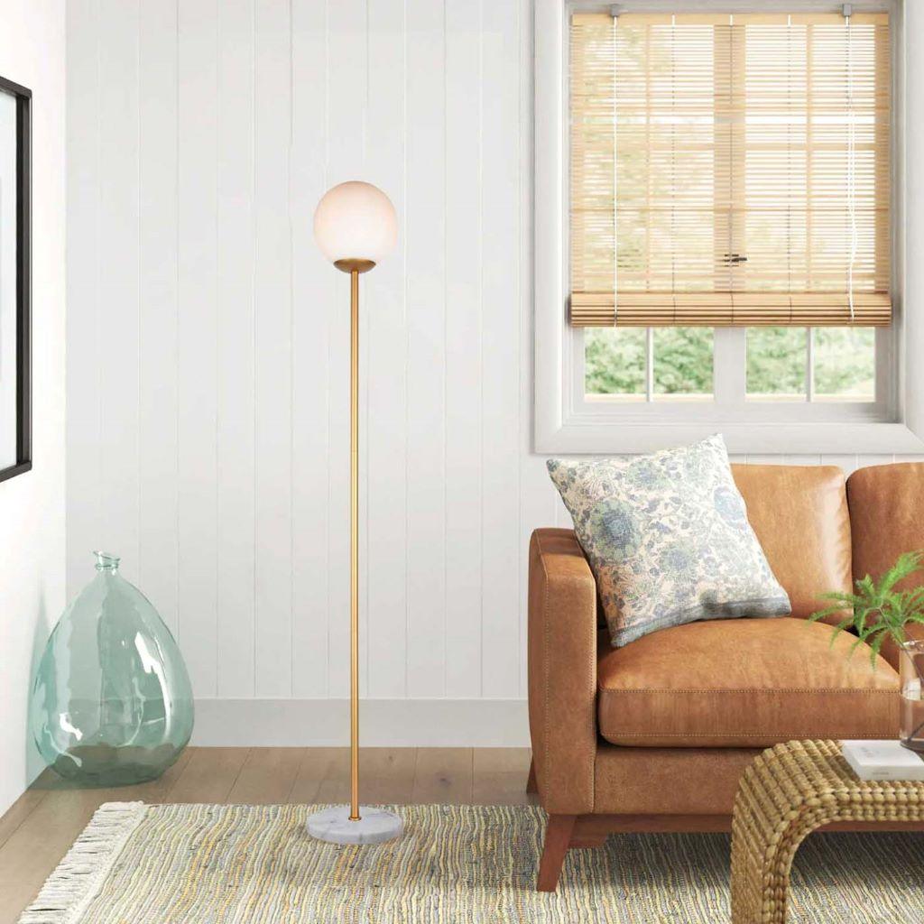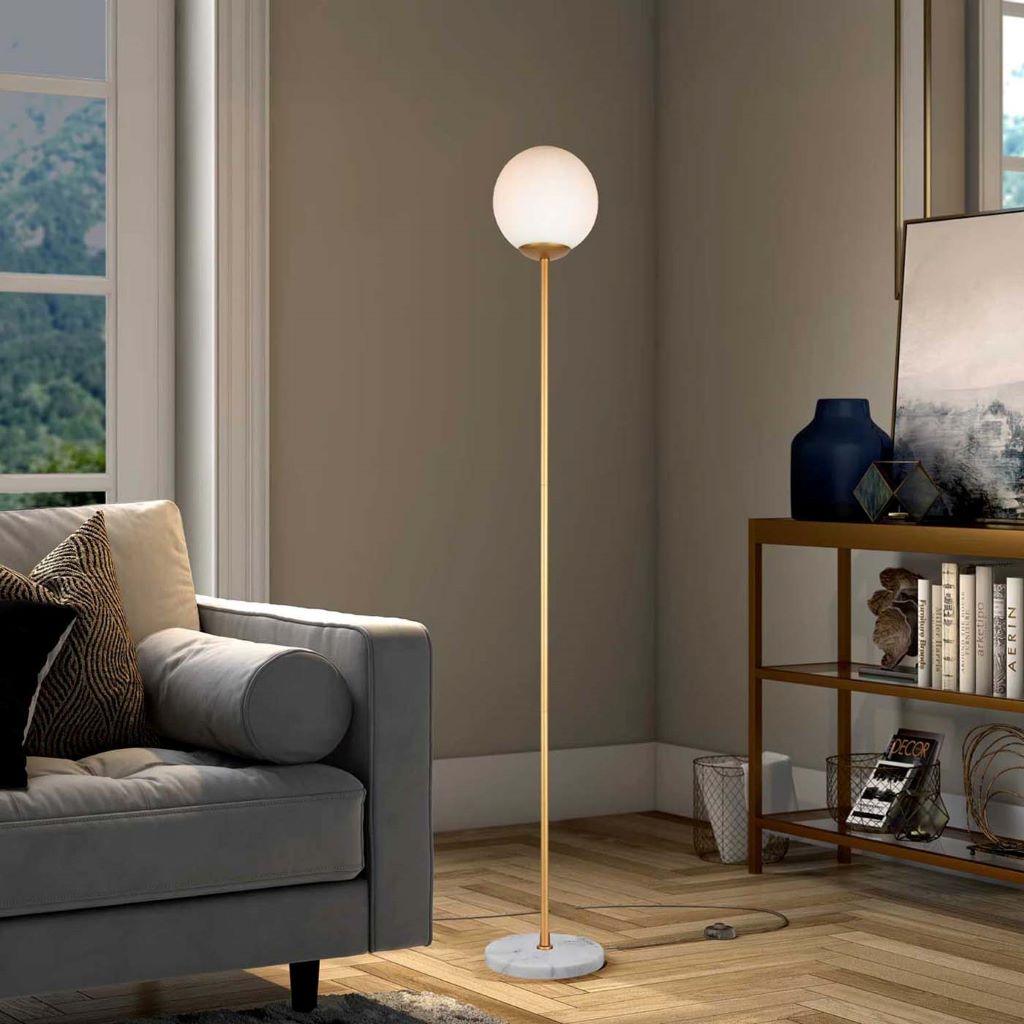 Lámpara, elaborado en Metal y Cristal; base mármol, acompañada de una esfera de cristal situada en medio de la estructura metálica, acabada en color Dorado.