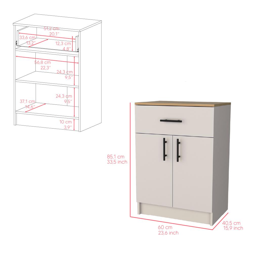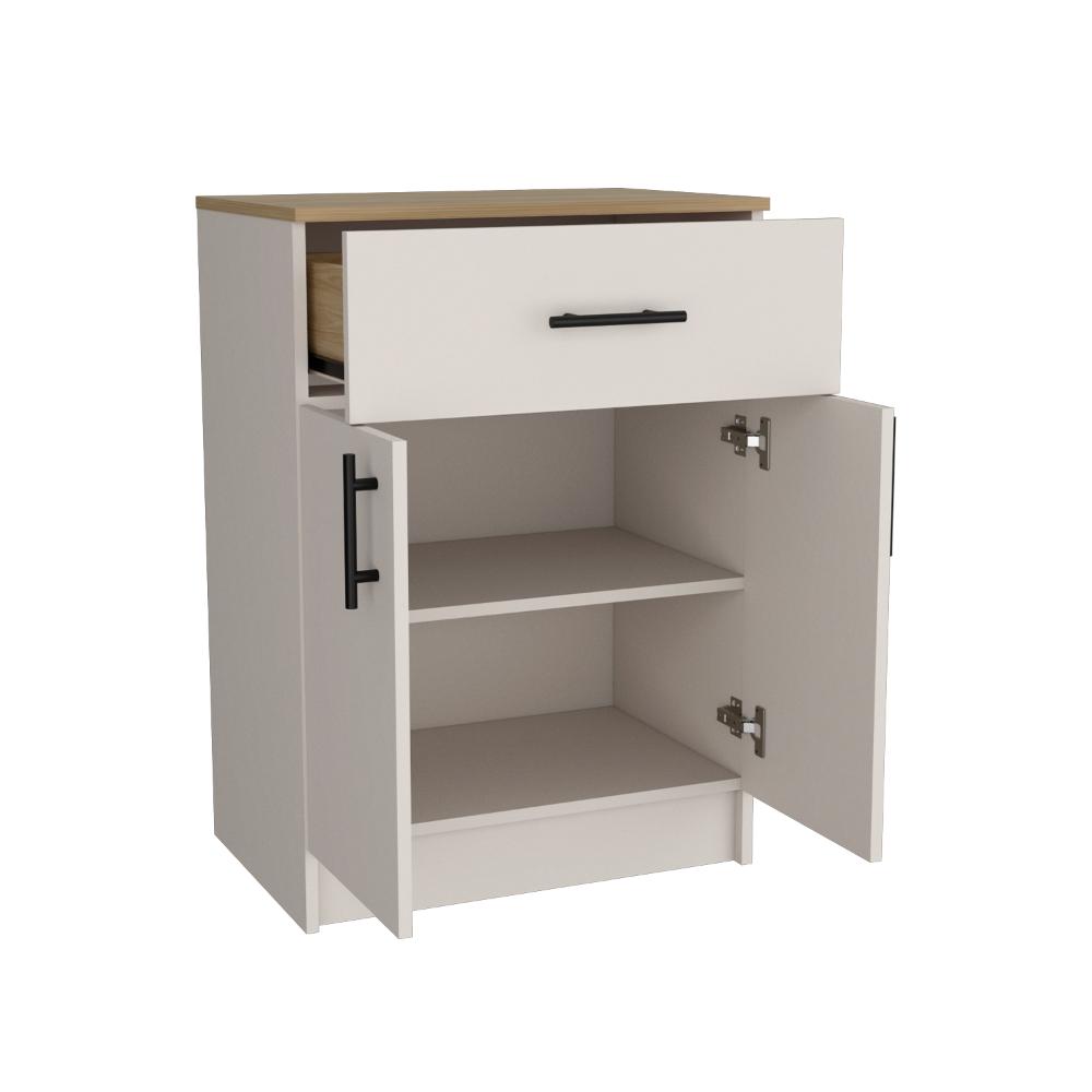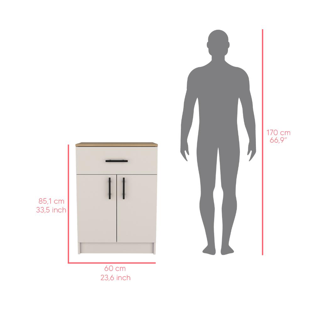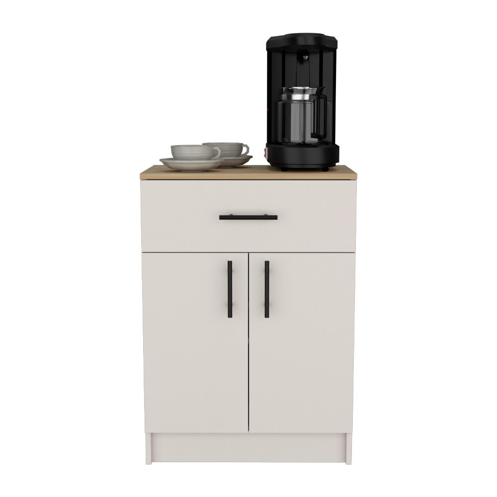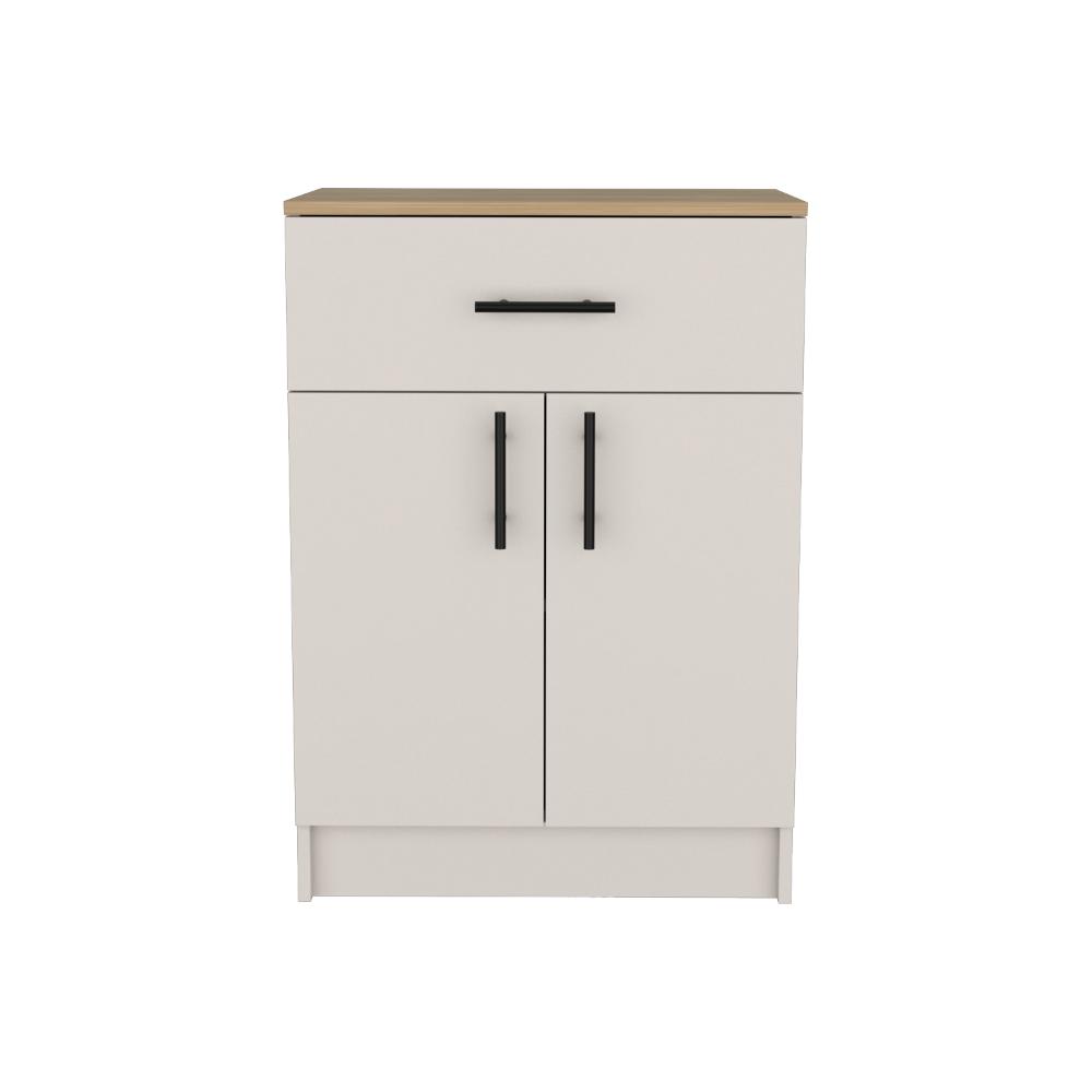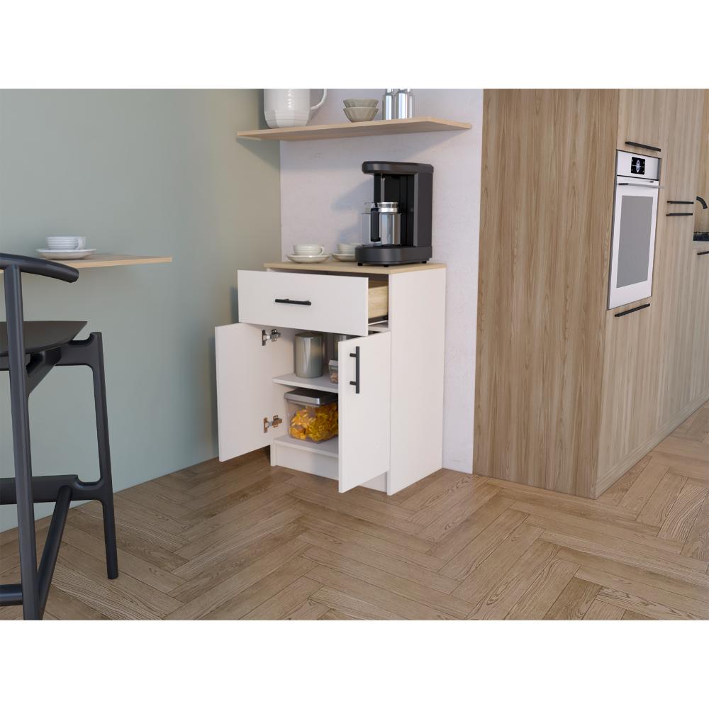 Mesa Auxiliar, con puertas abatibles, manijas metálicas, cajón superior, espacio para guardar insumos y utensilios de cocina