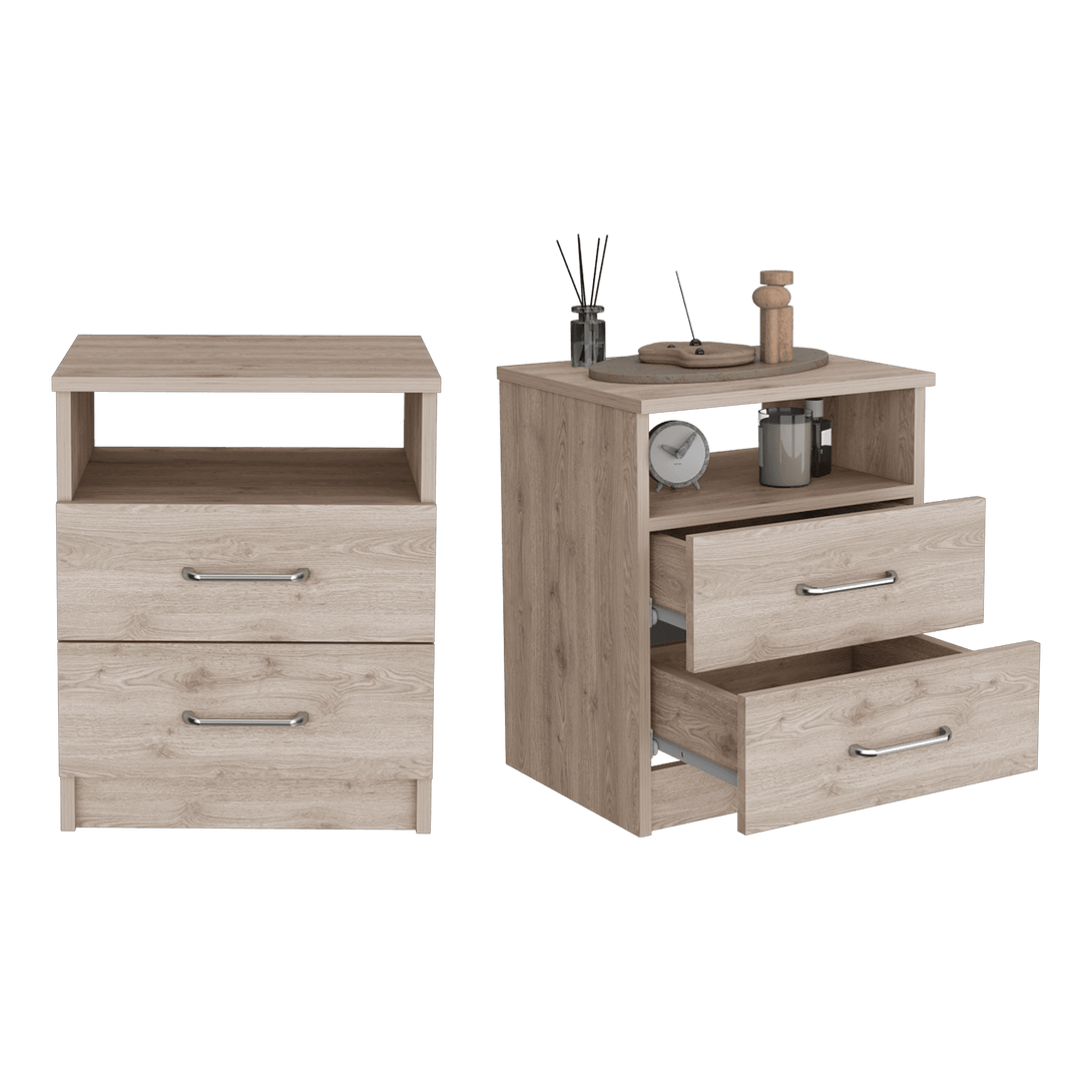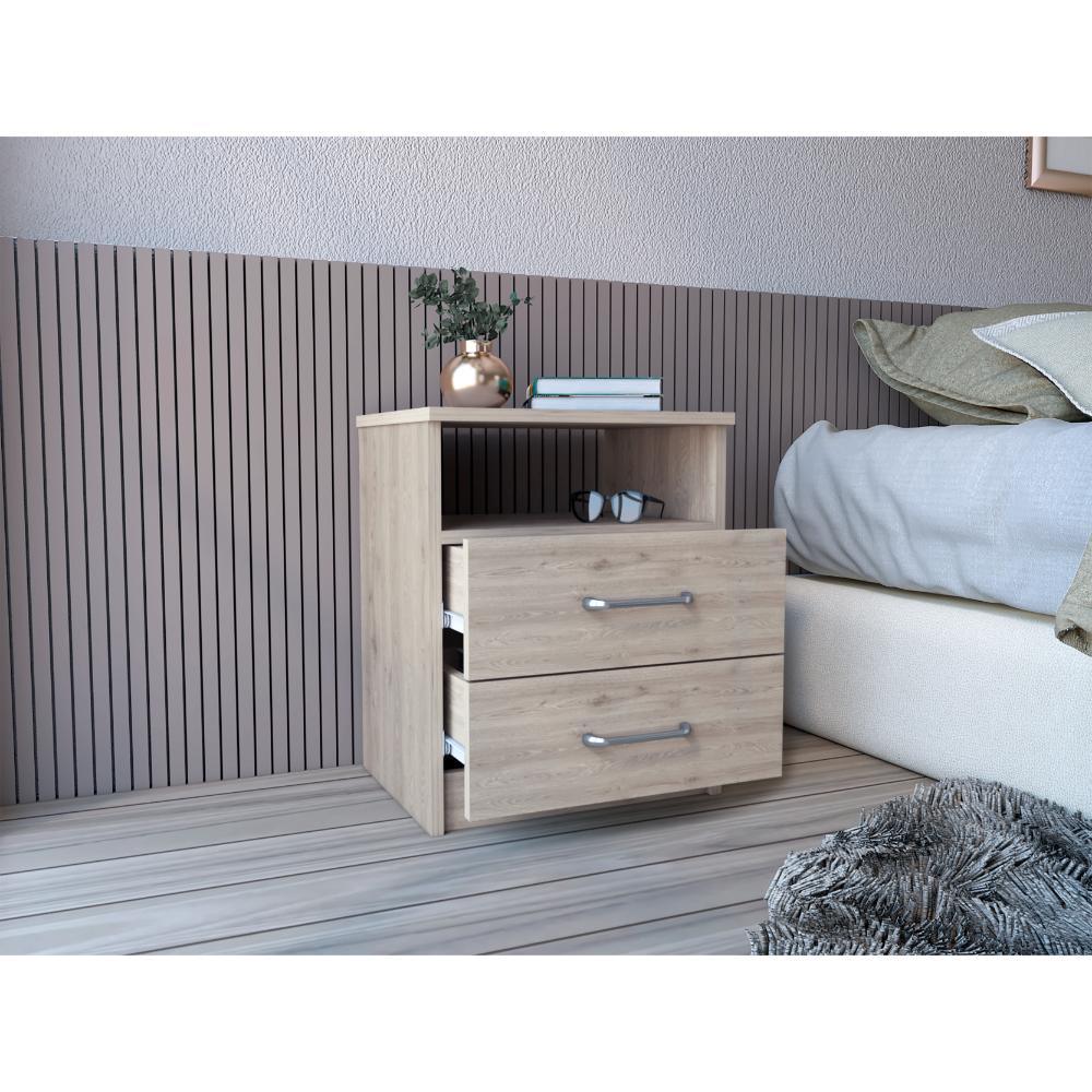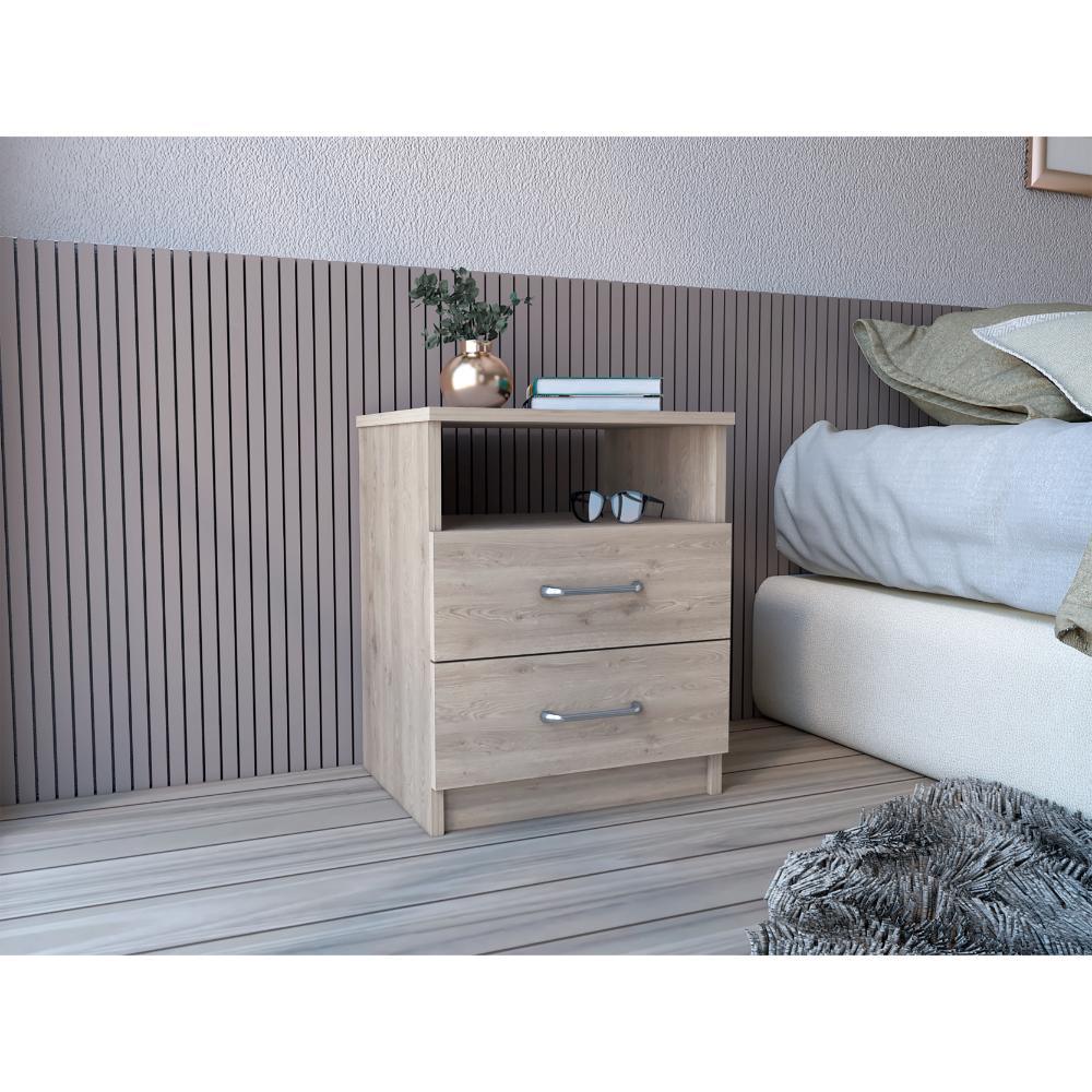 Mesa de Noche, con diseño practico y funcional, espacio para colocar objetos decorativos, dos cajones, fácil armado e instalación incluye manual de armado.