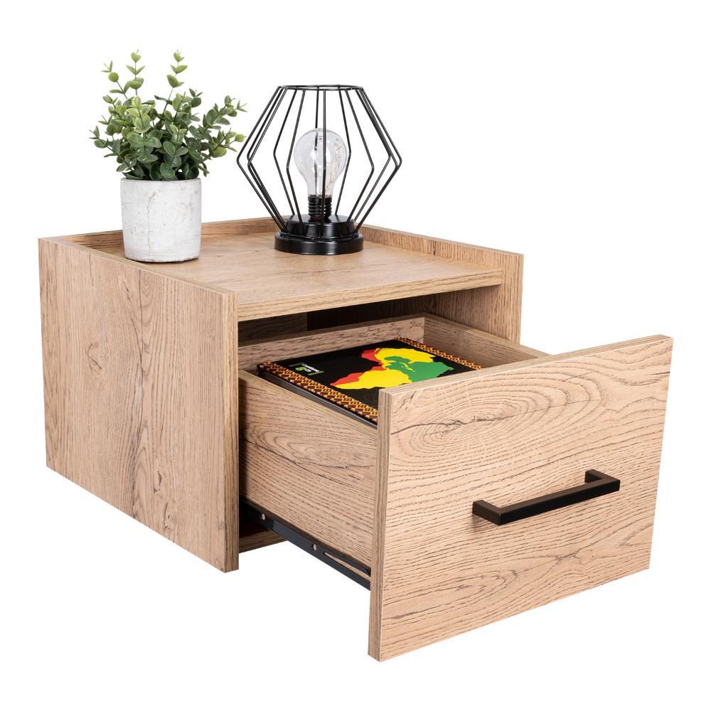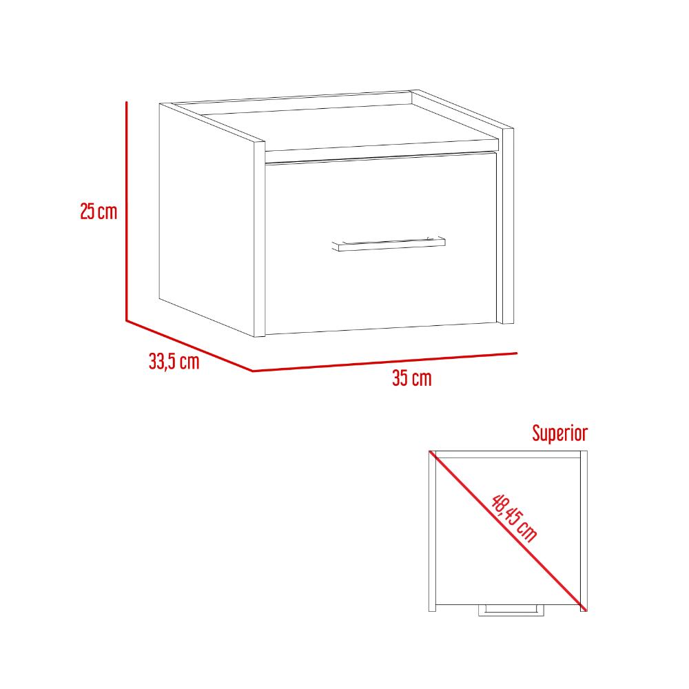 Mesa de Noche Flotante, con espacio para colocar objetos decorativos, diseño moderno, y un cajón.