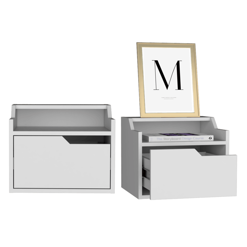 Mesa de Noche Flotante, con espacio para colocar objetos decorativos, diseño moderno y un cajón.