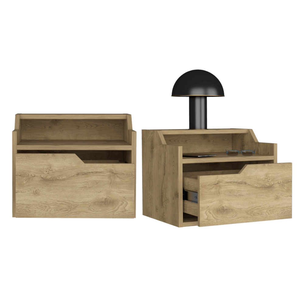 Mesa de Noche Flotante, con espacio para colocar objetos decorativos, diseño moderno y un cajón.