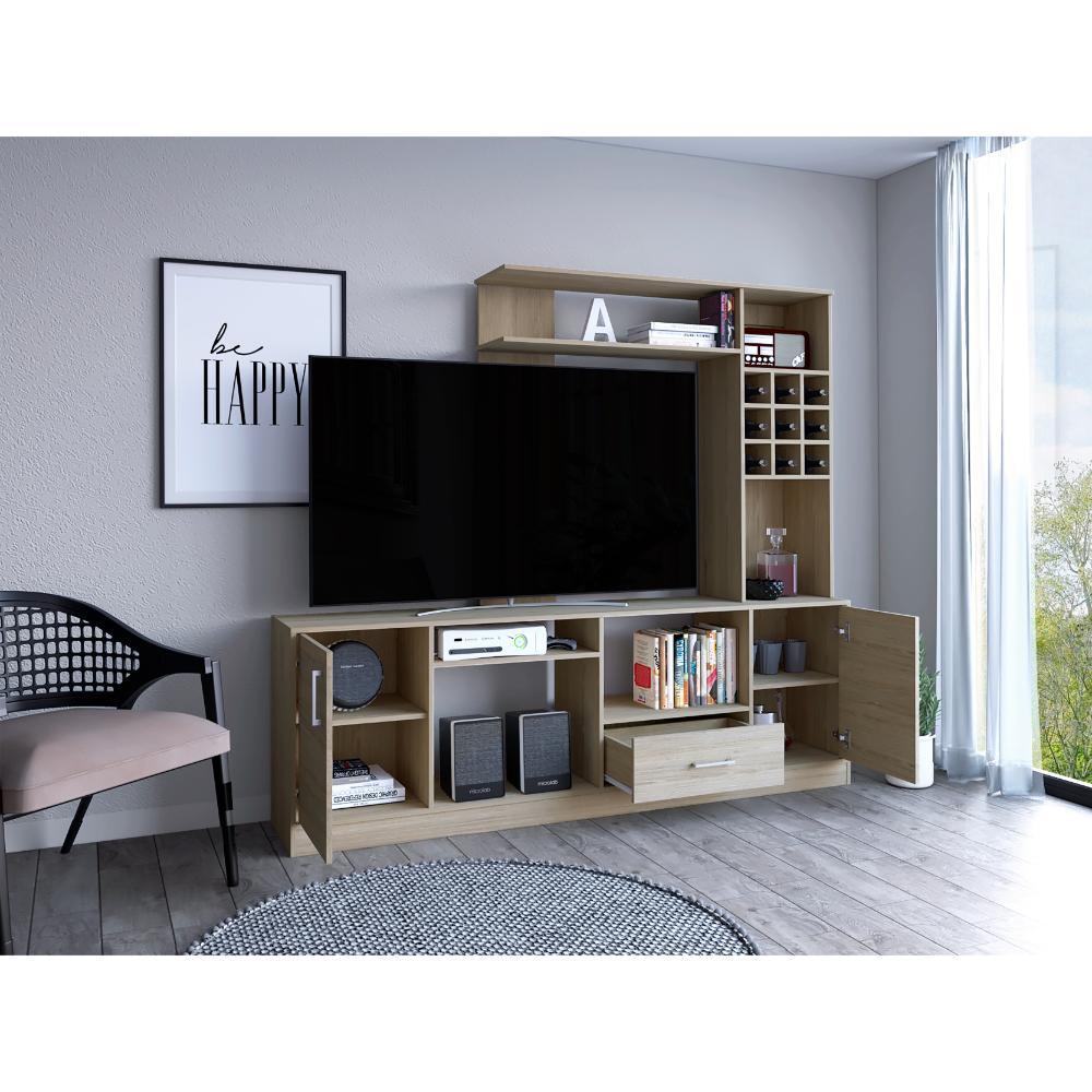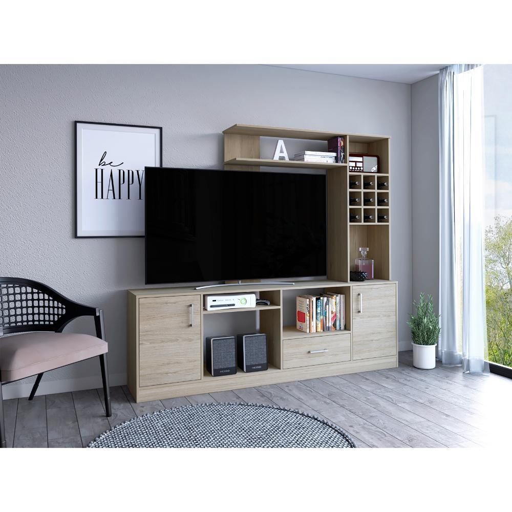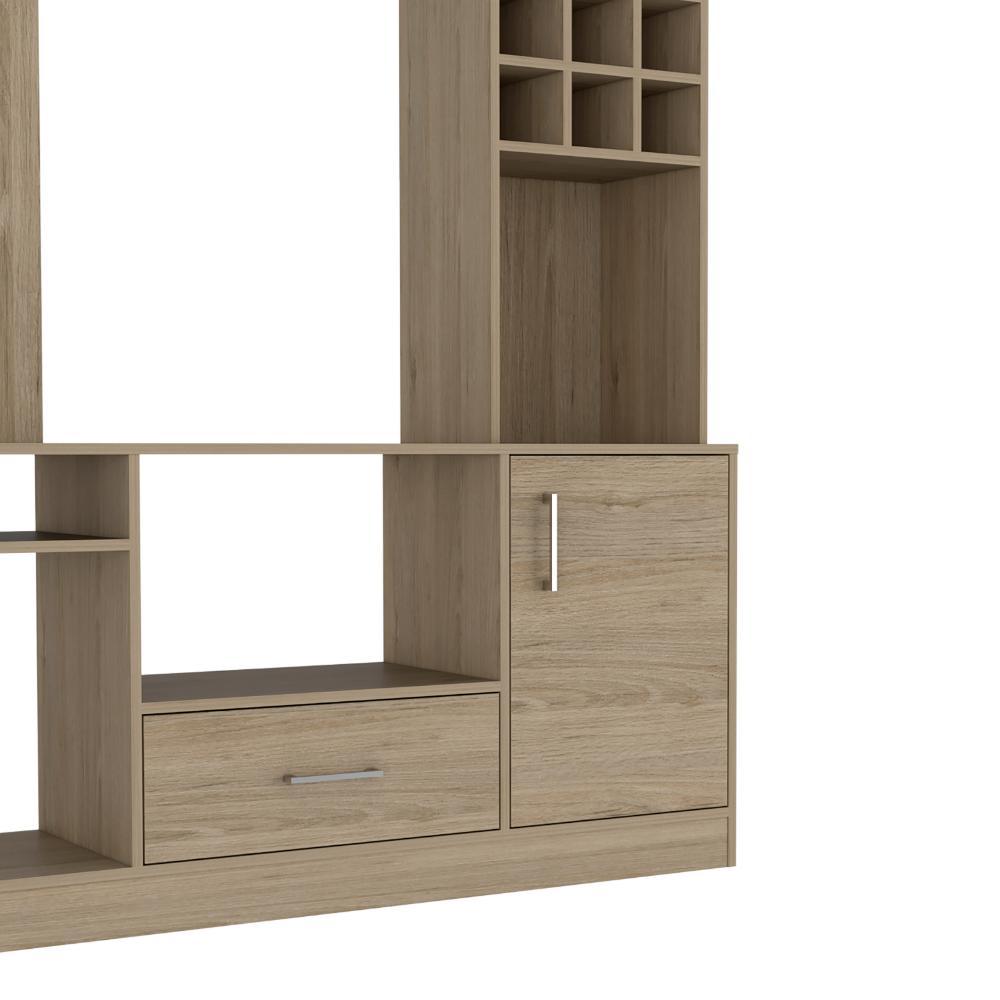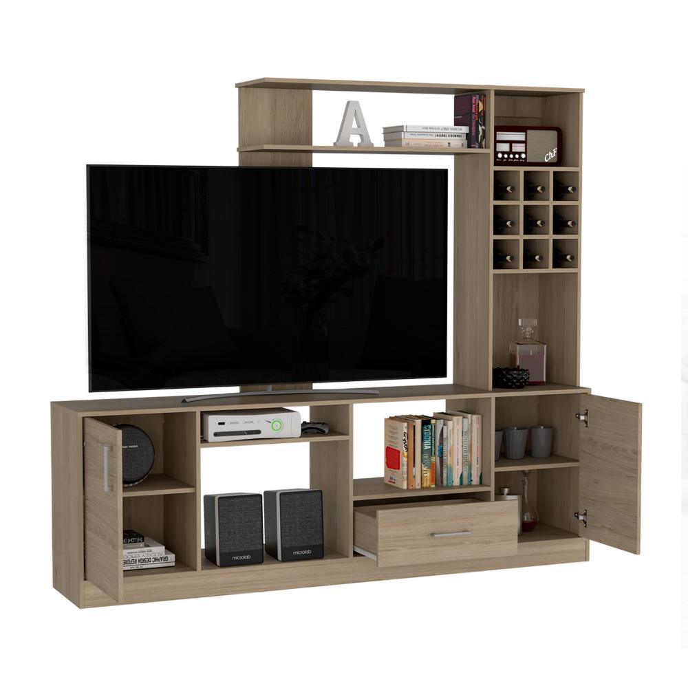 Mesa de TV con rack para vinos, espacio para TV hasta de 60'', espacio para DVD y aparatos electrónicos.