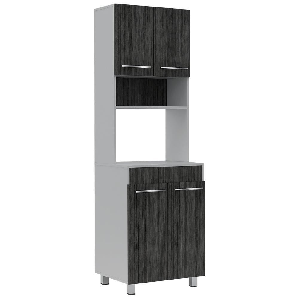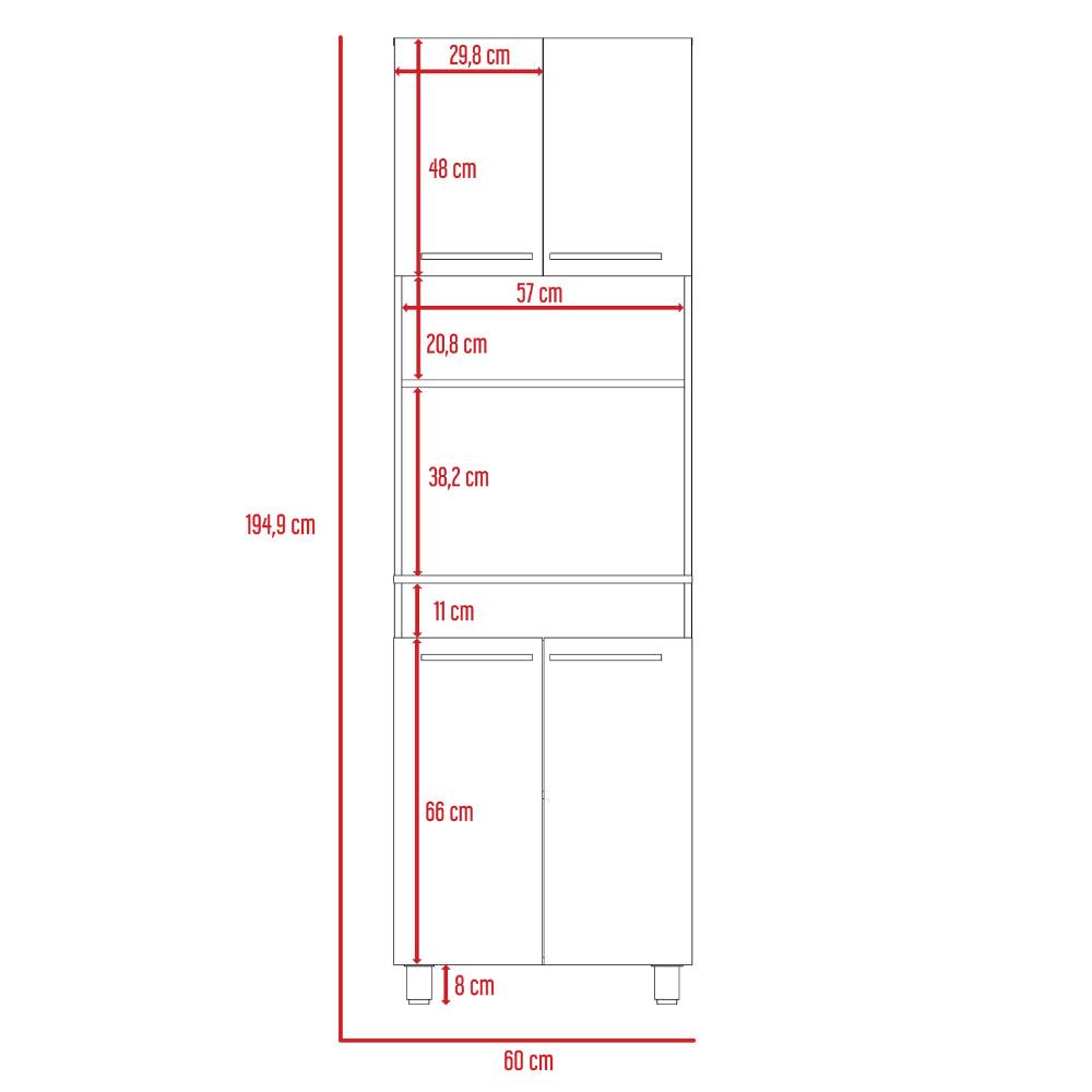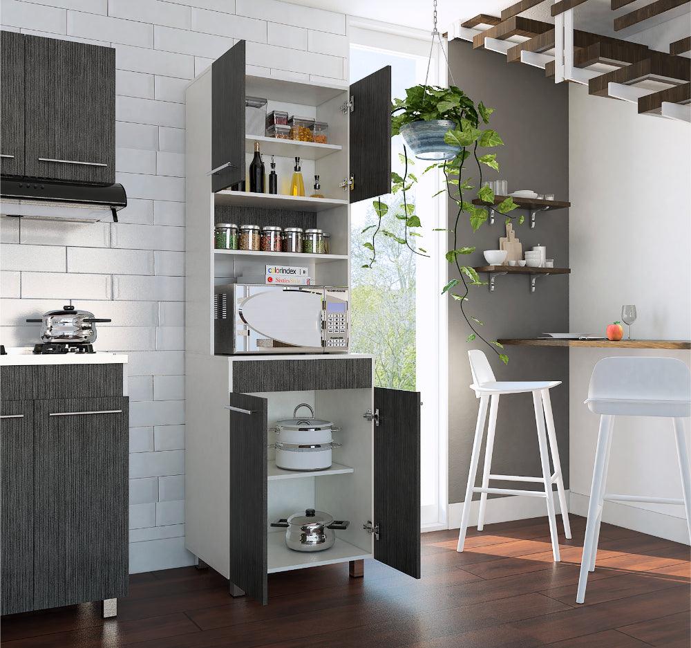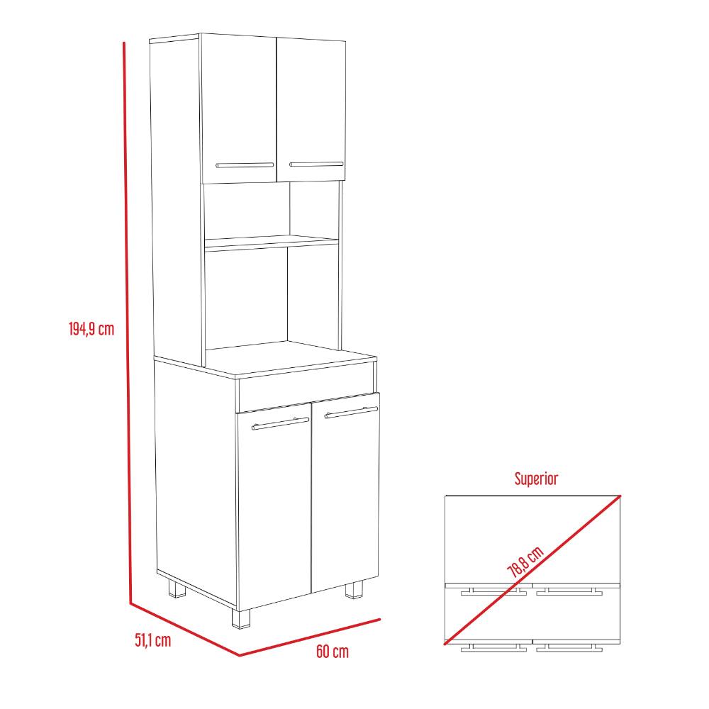 Módulo Microondas, con variedad de entrepaños, espacio para microondas, 4 puertas batientes, manijas y patas metálicas.