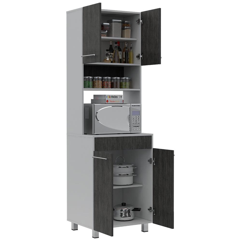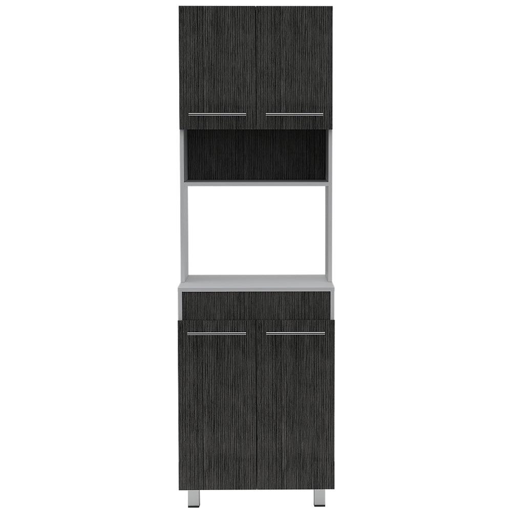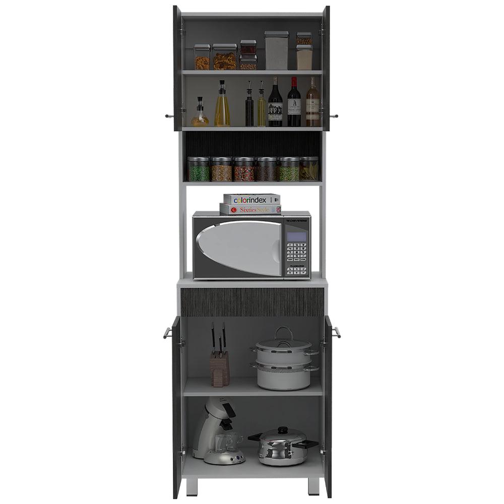 Módulo Microondas, con variedad de entrepaños, espacio para microondas, 4 puertas batientes, manijas y patas metálicas.