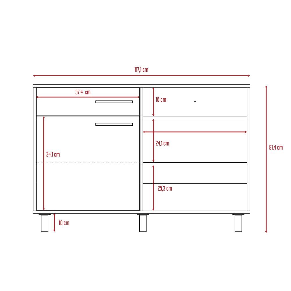 Mesa Multiusos, con un cajón extensión total y una puerta batiente de apertura sin manija. Múltiples entrepaños y superficies para ubicar objetos.