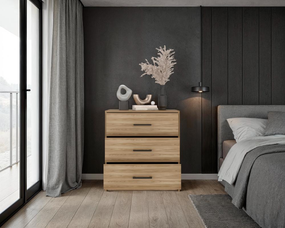 Organizador, con tres amplios cajones deslizables para guardar objetos personales, espacio superior para objetos decorativos y diseño moderno.