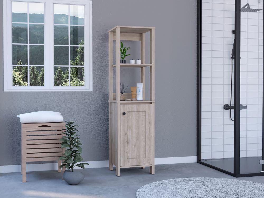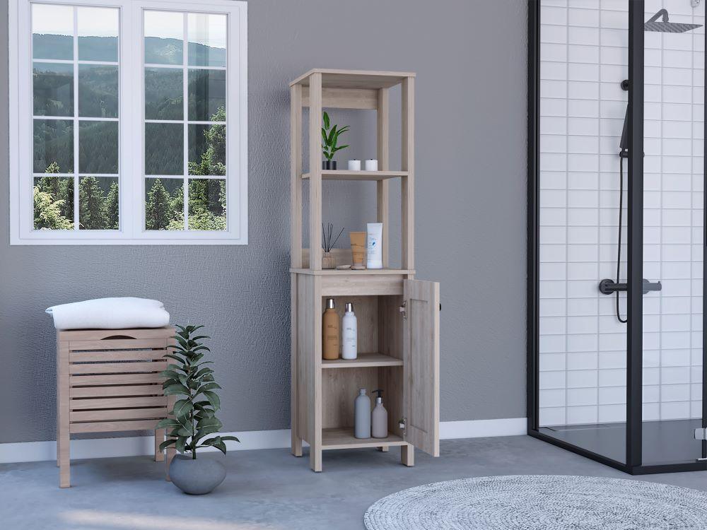 Organizador de Baño, con 1 puerta batientes y varios entrepaños para ubicar objetos de aseo.