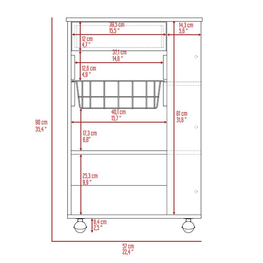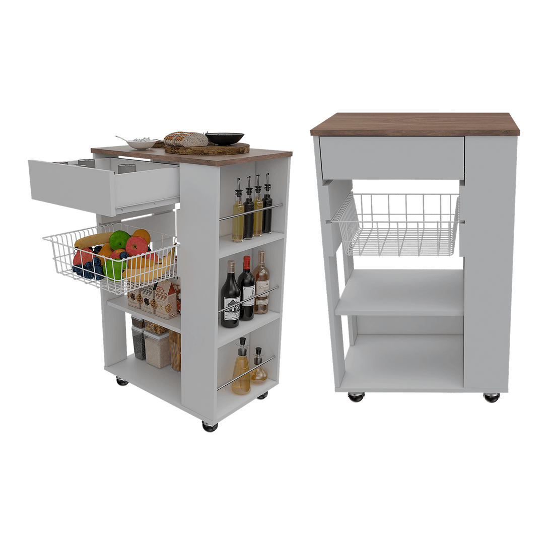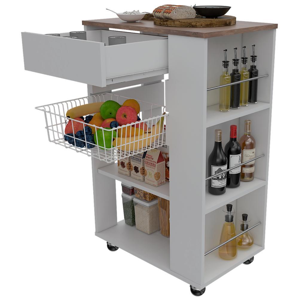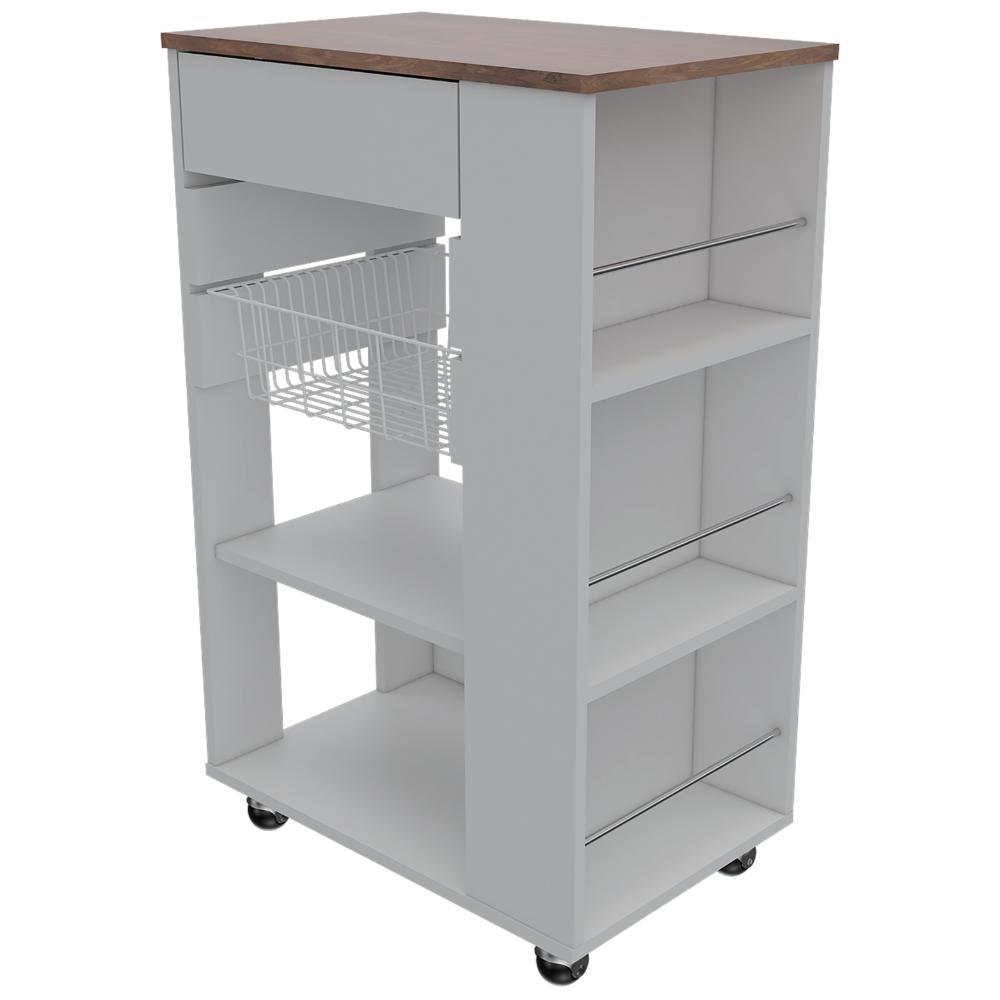 Mueble Organizador de Cocina, con canasta para almacenar, un cajon, entrepaños y mesa de apoyo.