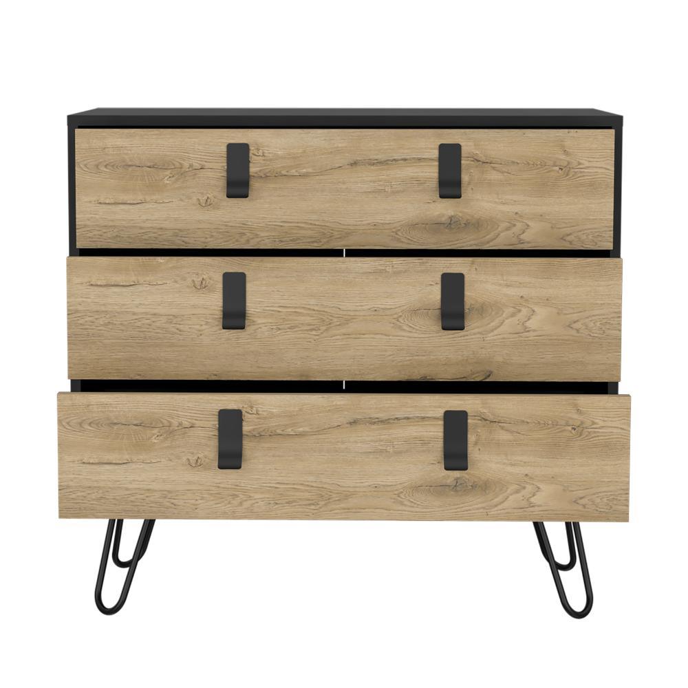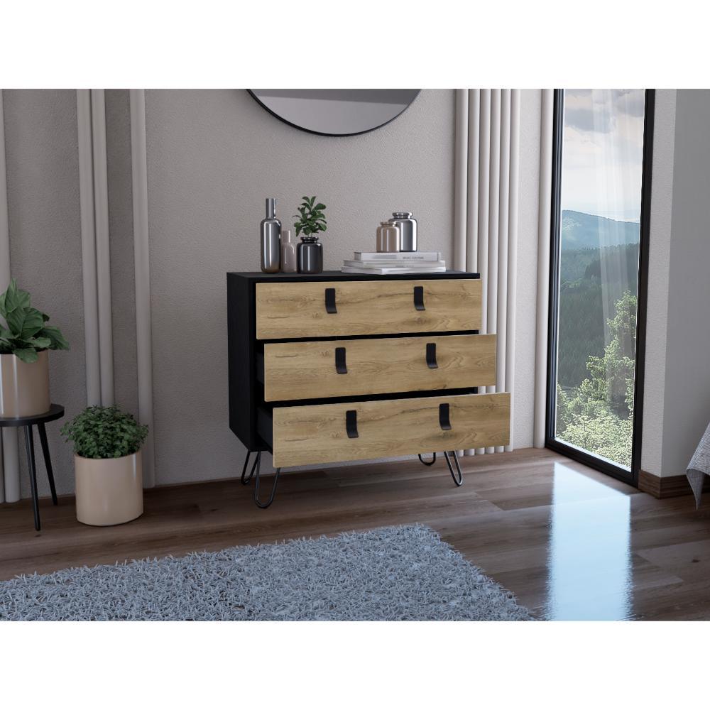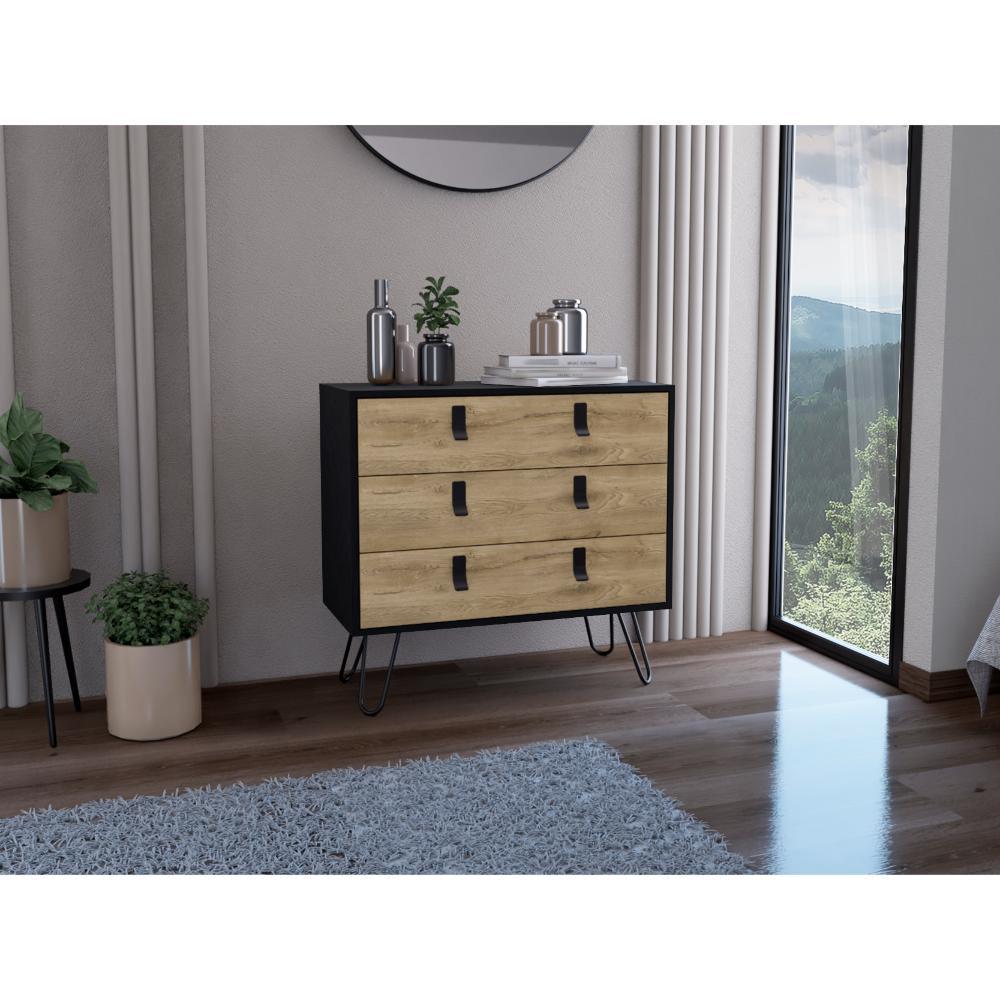 Organizador, con tres amplios cajones deslizadores para guardar objetos personales, espacio superior para objetos decorativos, manijas y rieles metálicos.