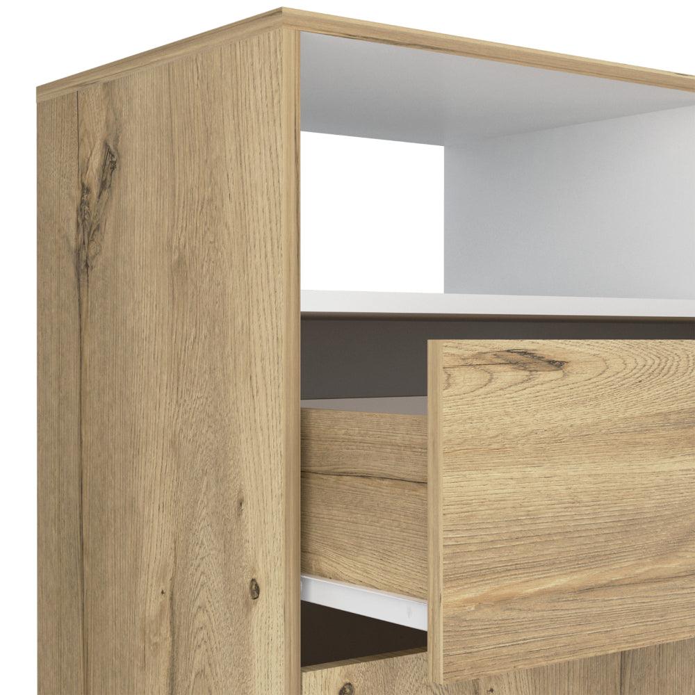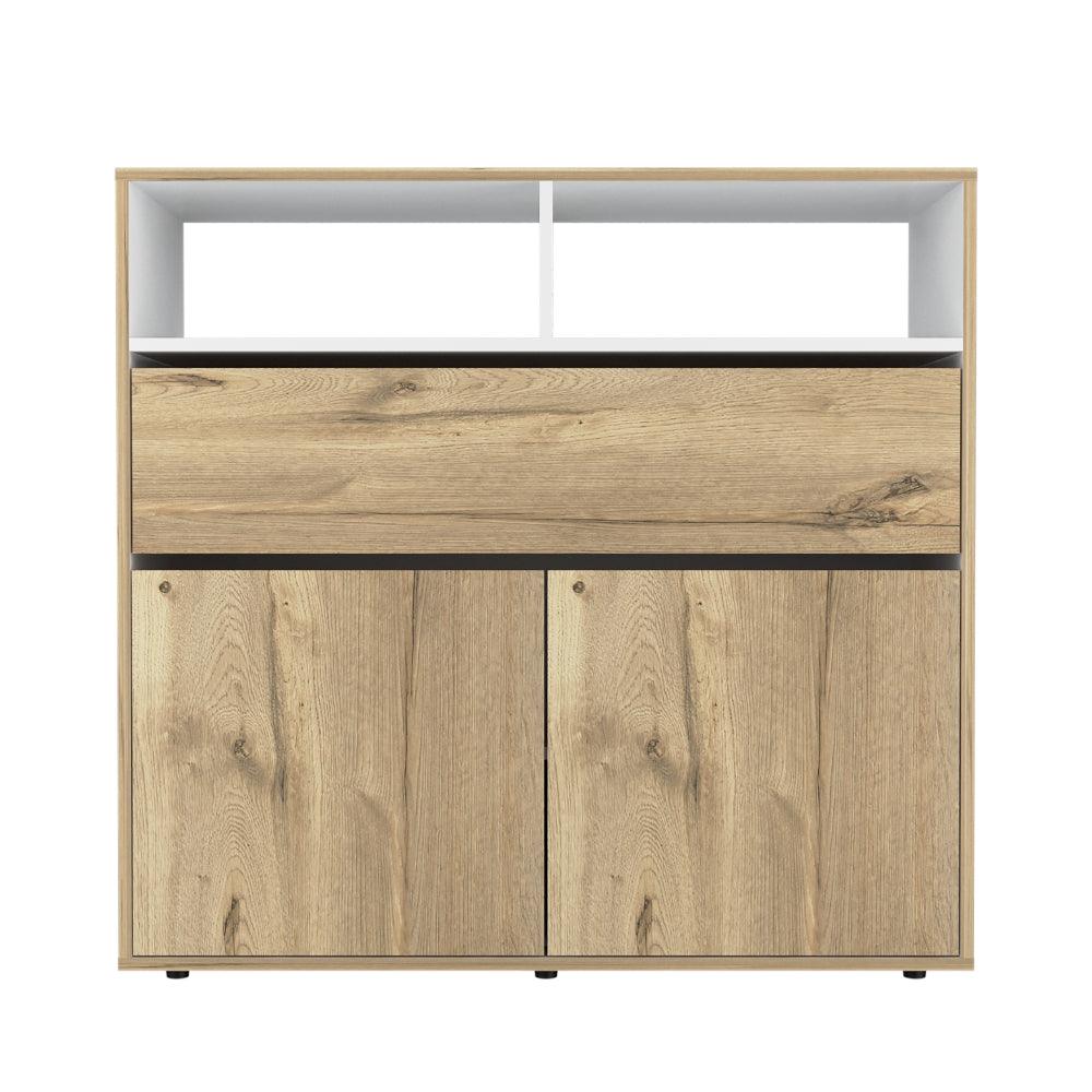Elaborado en Madera aglomerada MDP, recubierta con láminas melamínicas de excelente calidad, en color Café Claro y Blanco.