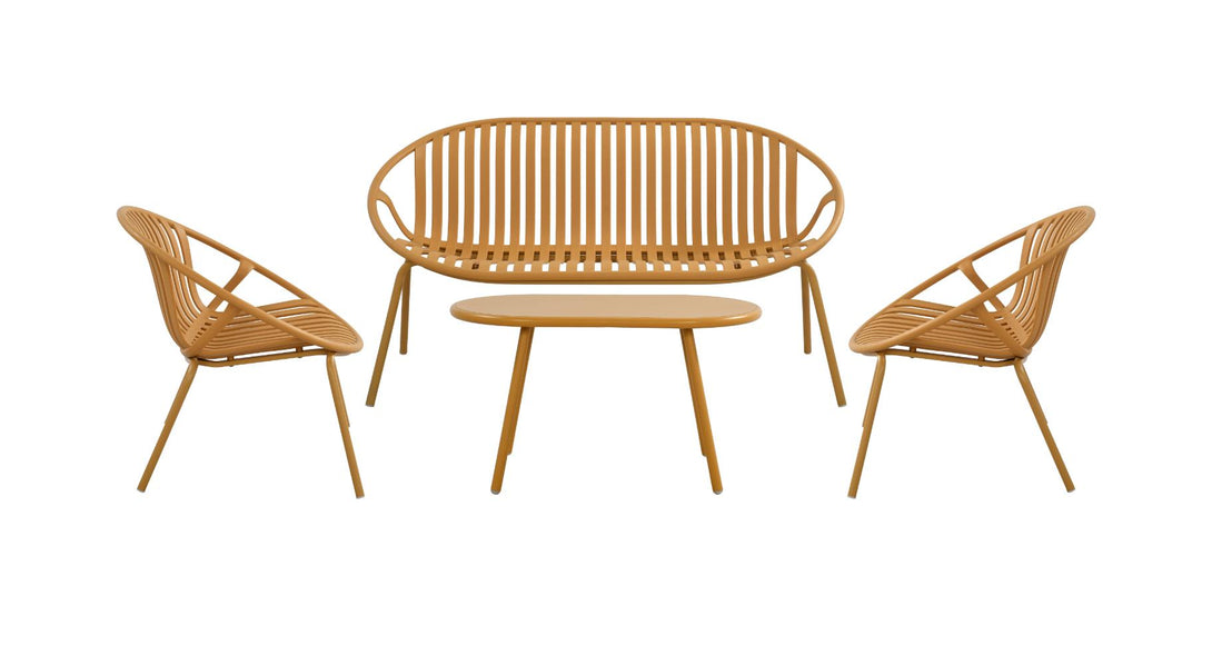 Elaborado en Polipropileno y protección a los rayos UV el set incluye mesa centro, dos sillas y un banco en patas metalicas, en Color Naranja