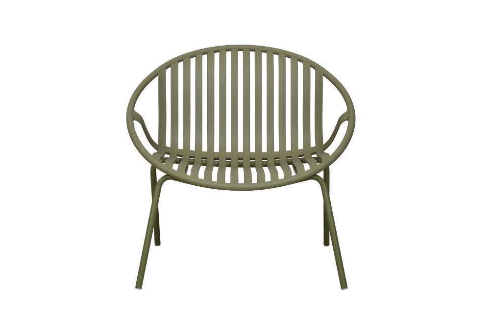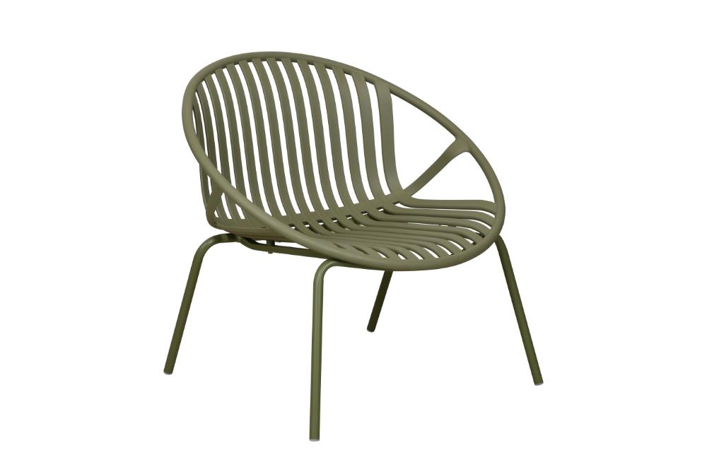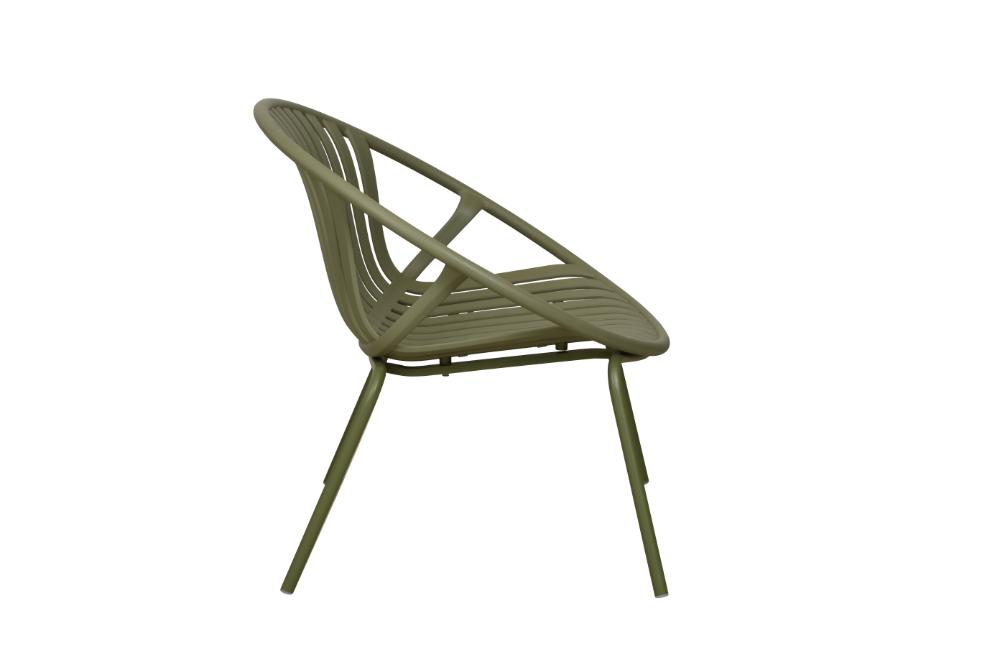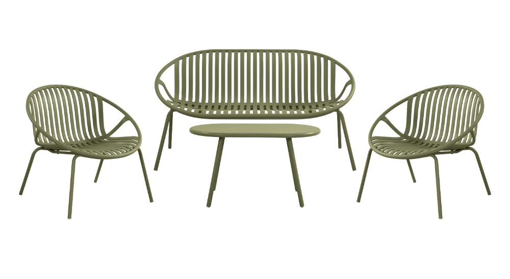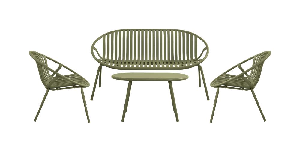 Elaborado en Polipropileno y protección a los rayos UV el set incluye mesa centro, dos sillas y un banco en patas metalicas, en Color Verde Olivo