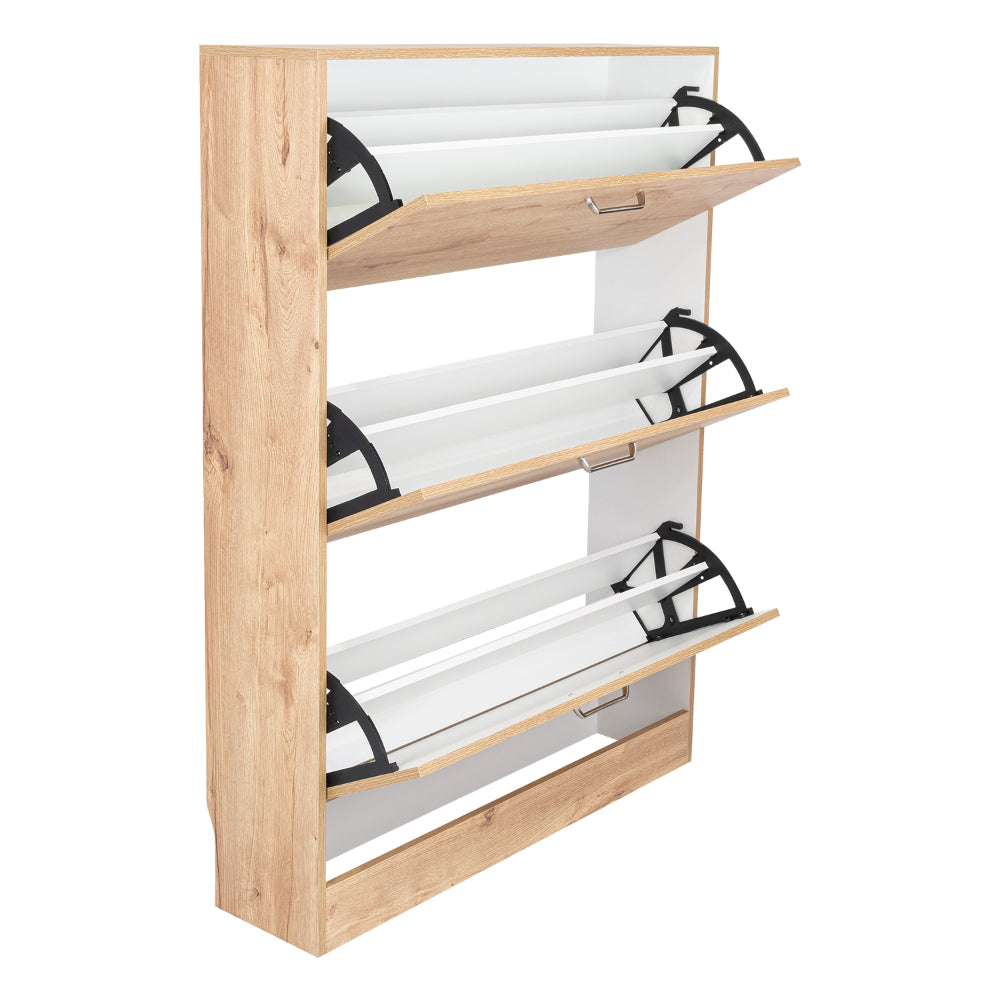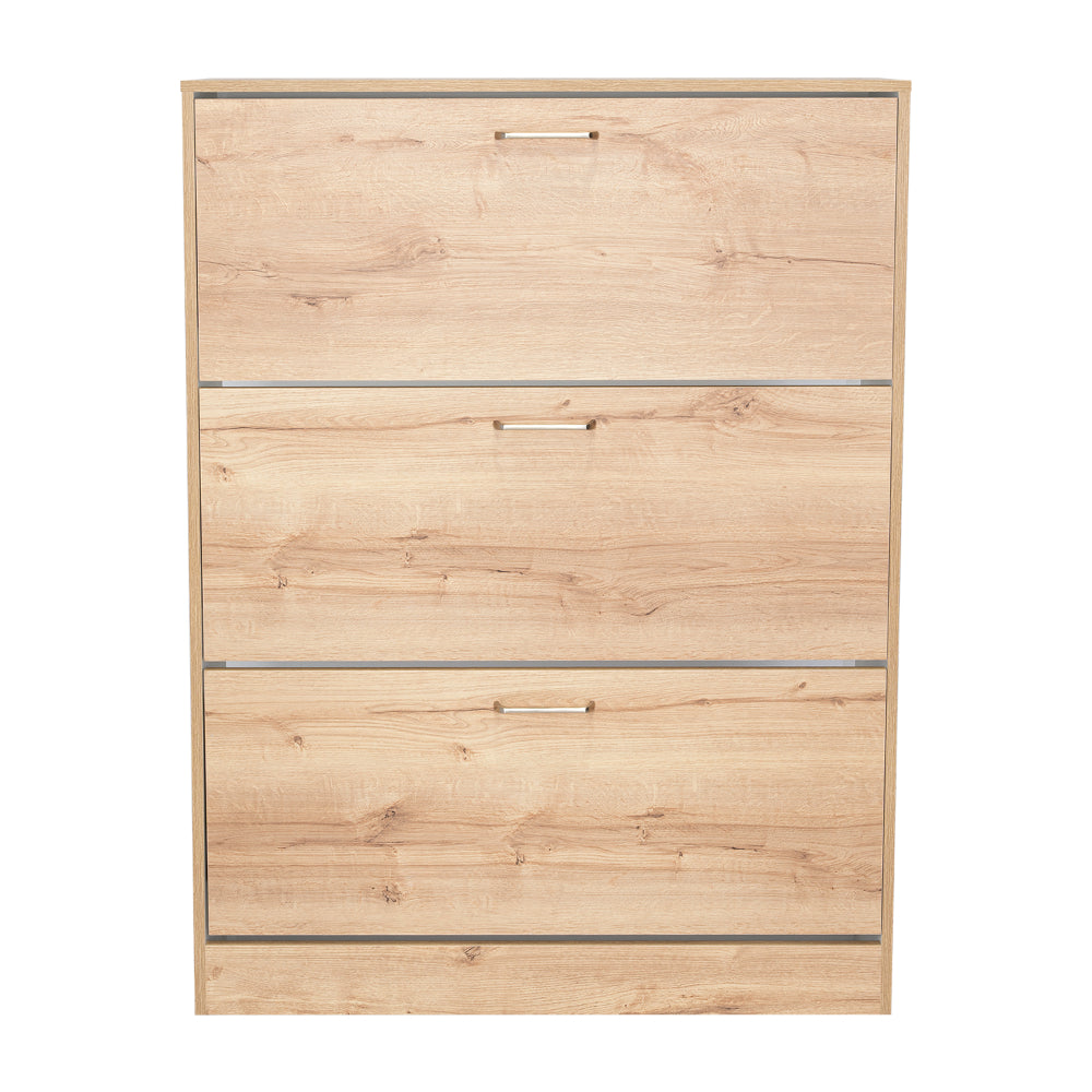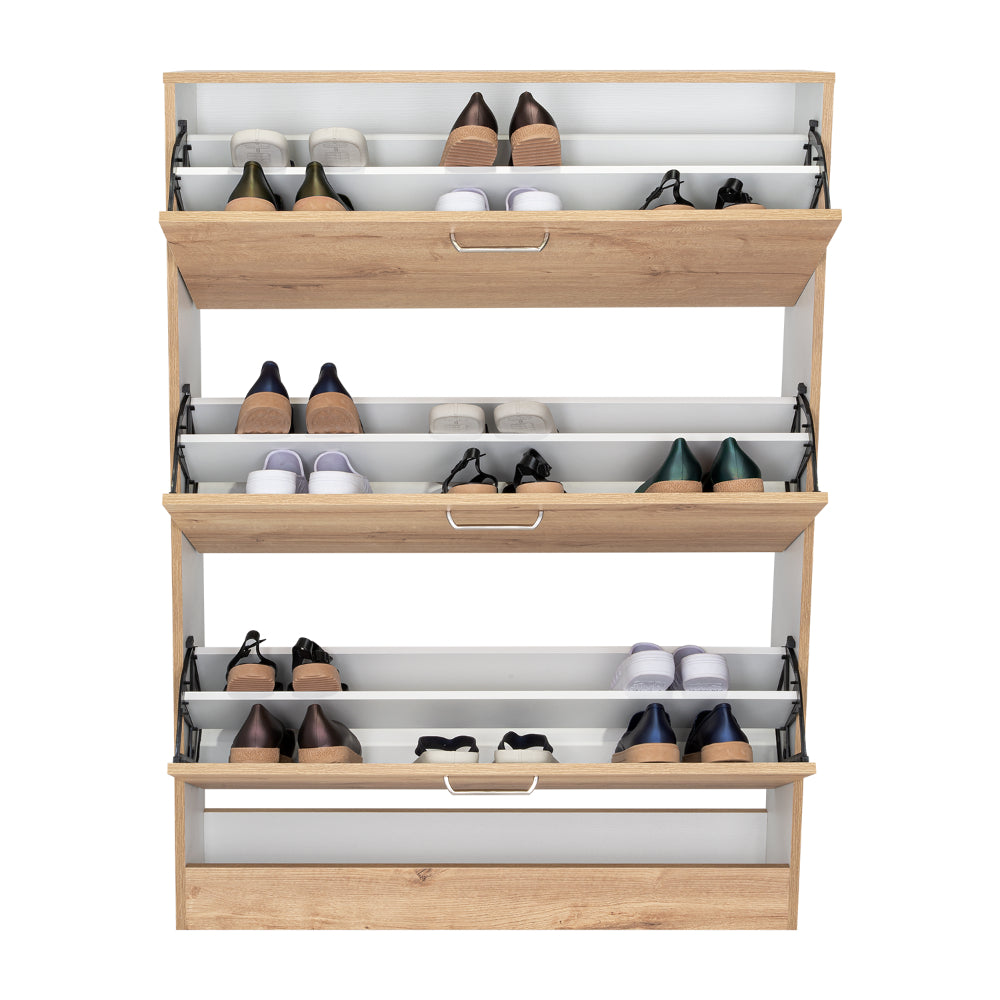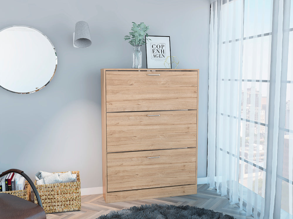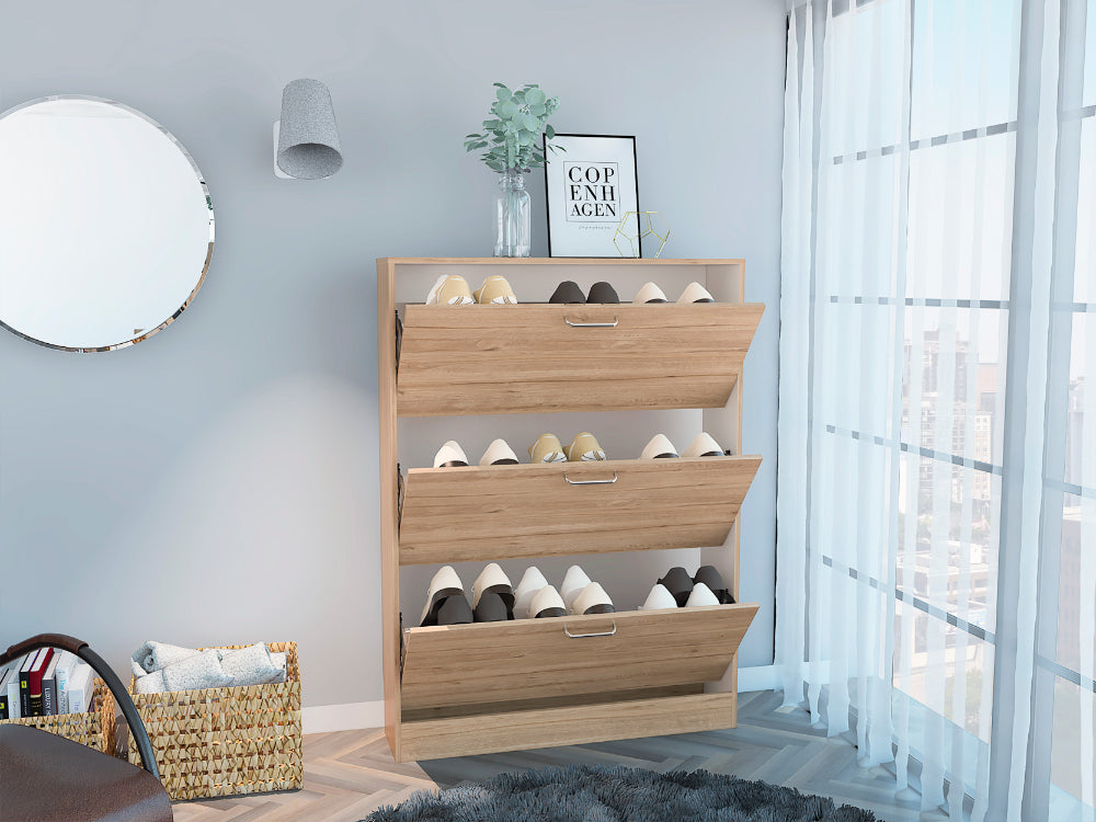 Zapatero, con espacio para almacenar zapatos, con diseño funcional y tres puertas abatibles e incluye manijas metálicas.