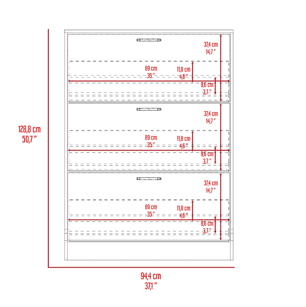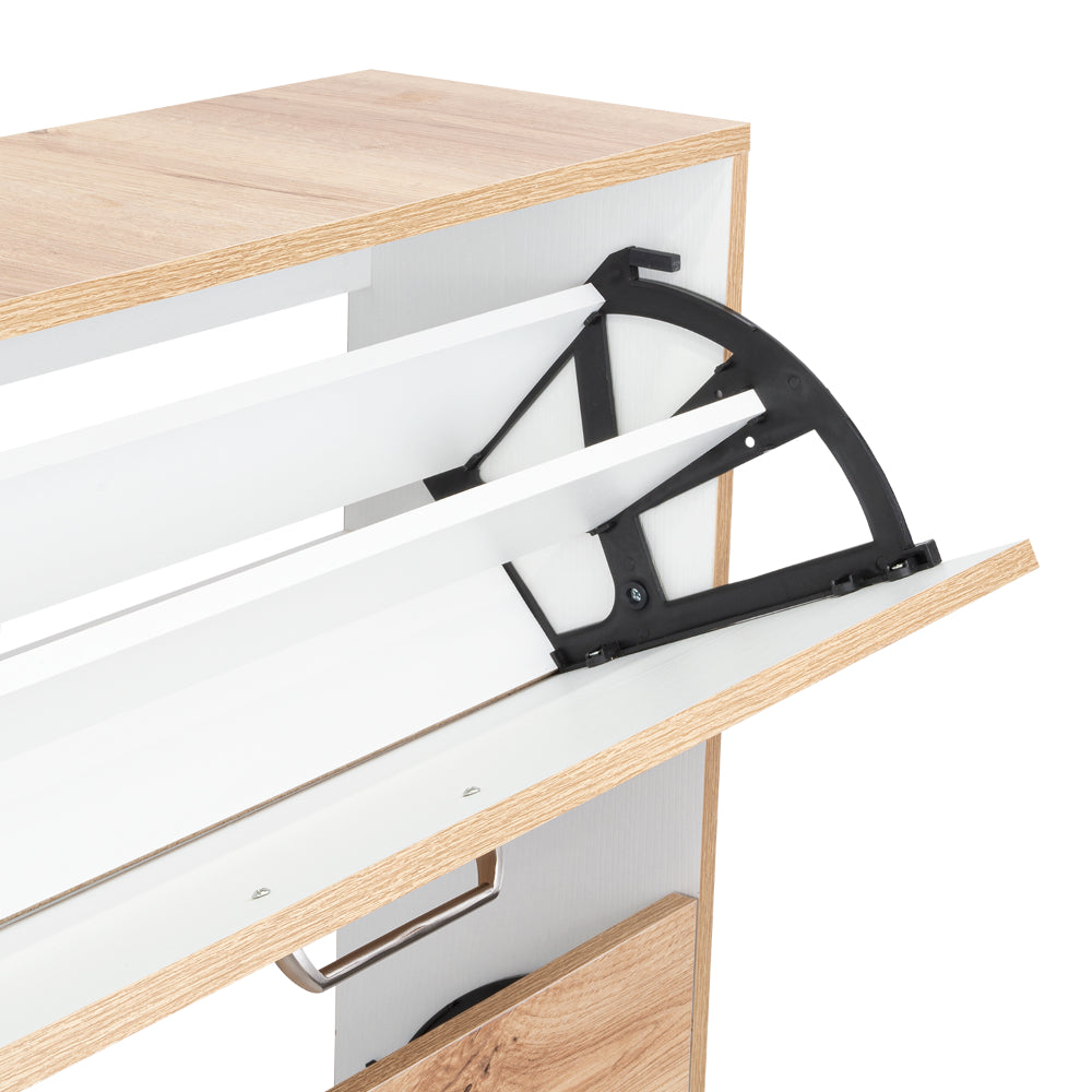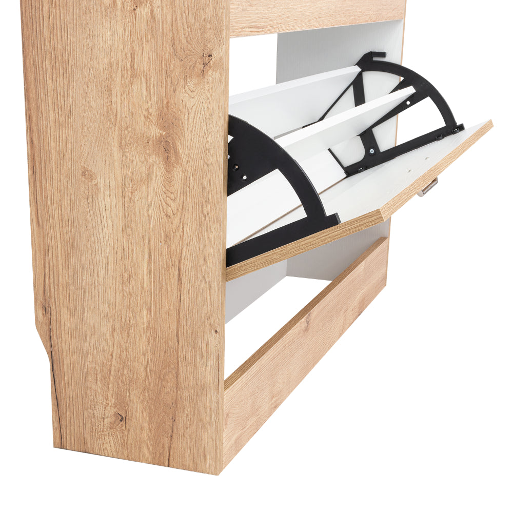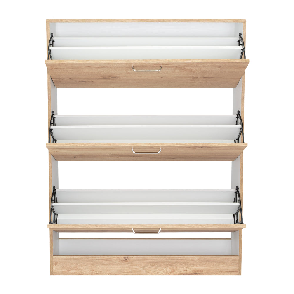 Zapatero, con espacio para almacenar zapatos, con diseño funcional y tres puertas abatibles e incluye manijas metálicas.